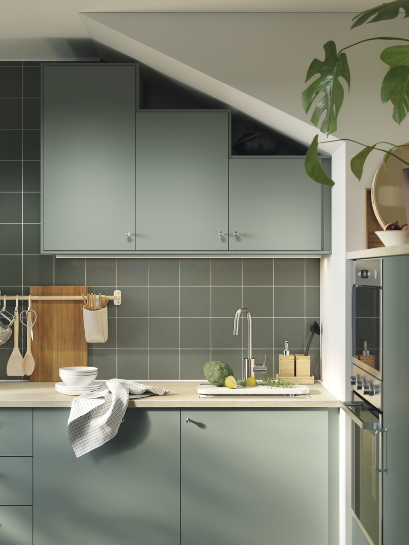 L 形鼠尾草綠廚房,搭配霧面 NICKEBO 面板和流暢線條,就是簡約風現代廚房。能和空間完美契合的 METOD 系統櫃,收好廚房用具,讓空間整潔平靜。靈活巧妙的收納解方,把小廚房變成可滿足烹飪、用餐和社交的神奇空間。