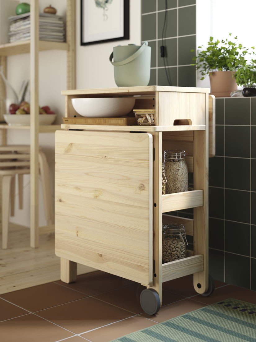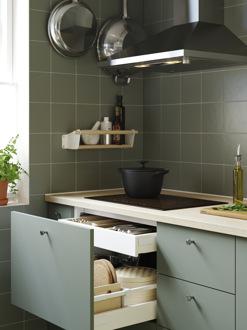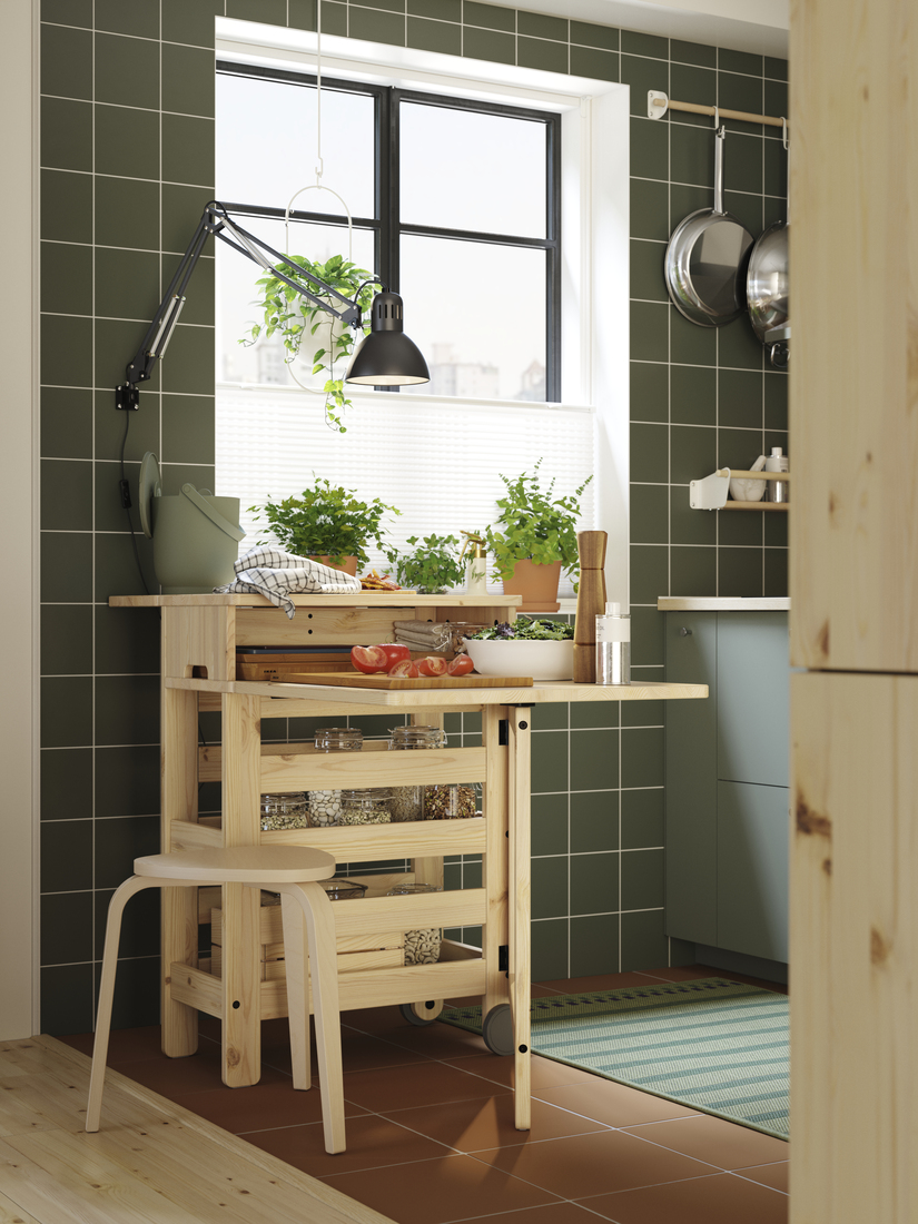 渴望擁有充滿自然氣息的現代廚房?灰綠色霧面 NICKEBO 櫥櫃面板,以簡潔線條營造溫暖氛圍,還能依據你的需求和細節偏好,量身打造屬於你的廚房收納。輕巧的木質折疊桌帶來北歐質樸生活感。不但能作為雙人餐桌,還能提供額外收納空間。
