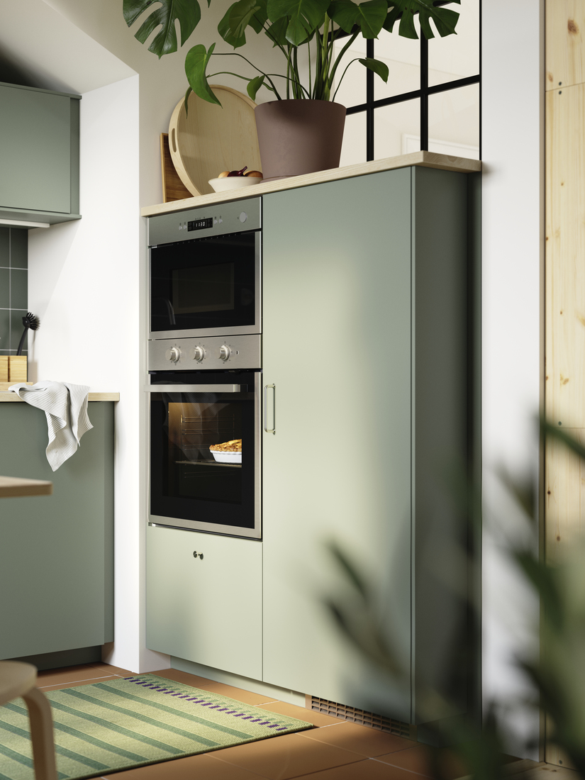 把能節省空間的 SUPERKALL 冰箱/冰櫃組合,放置在有著同款櫃門的櫥櫃裡,一眼望去更整齊有序。同高度的櫥櫃可放置烤箱、微波爐和額外收納,流線型的一致設計,可減少視覺混亂,讓廚房和家中其他空間融為一體。乾淨、簡單,就像 NICKEBO 面板一樣。