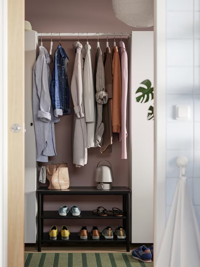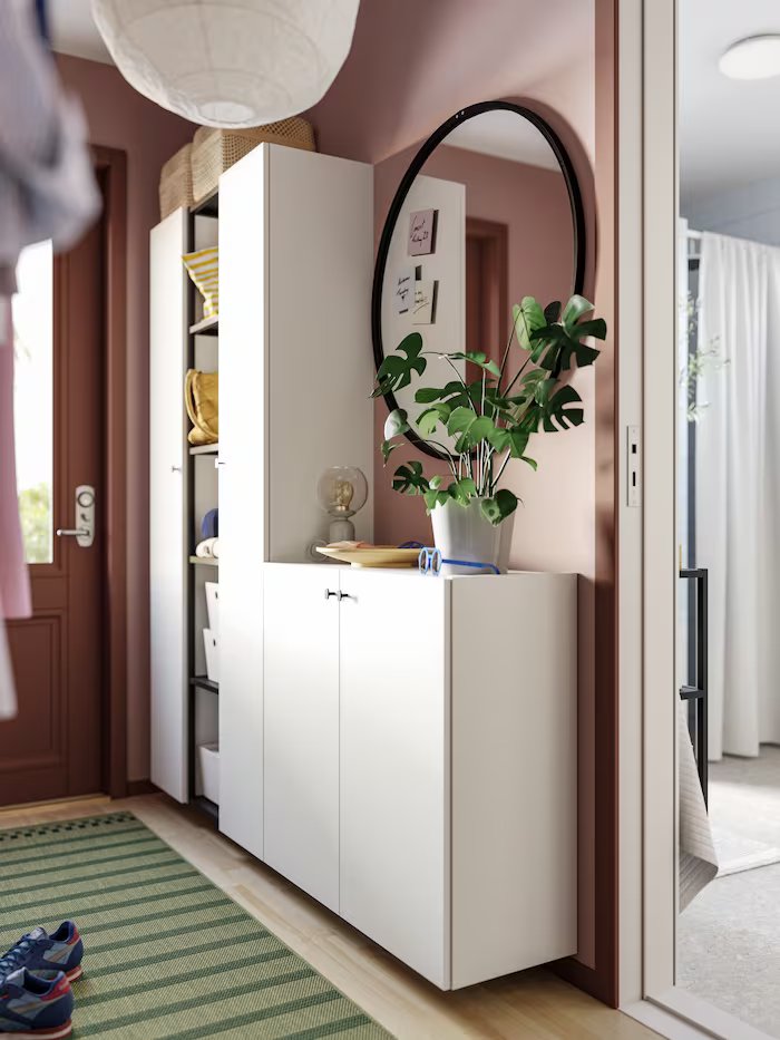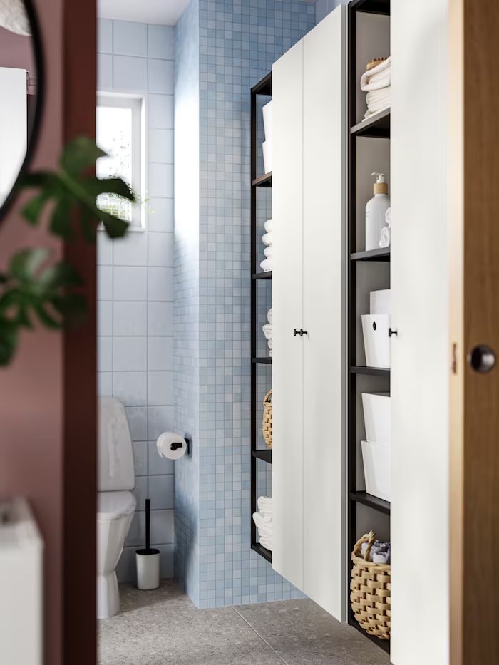 在走廊上放置多功能櫥櫃,延伸浴室的北歐風格。增添些許簡單單品和明亮的潮流色調,浴室門口立刻顯得有趣又風格獨具。
