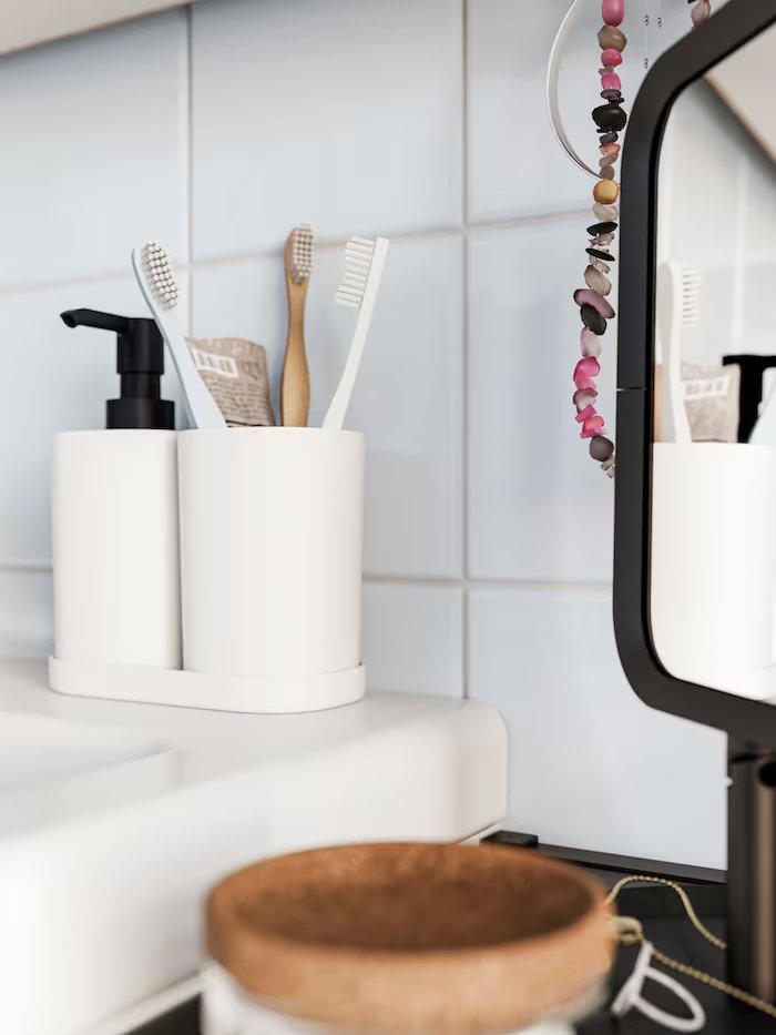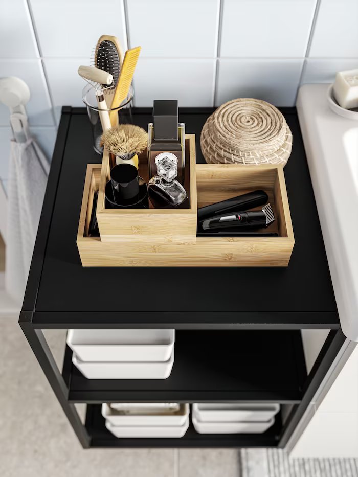 一早的準備工作可能會很忙碌,添加些巧妙配件,方便隨手拿取盥洗小物,同時保持浴室整潔,讓每個人的日常生活都更輕鬆流暢。混搭不同尺寸的竹製托盤和三件式白色收納套組,更便利好用,也和整體風格相得益彰。"