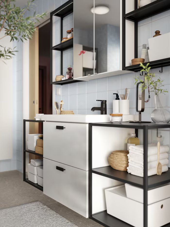 井井有條的收納空間,是保持共用浴室整潔有序的重要關鍵。對比鮮明的開放式黑色層架,可放置收納盒、籃和毛巾,也為簡單清爽的空間帶來設計趣味和現代感。
