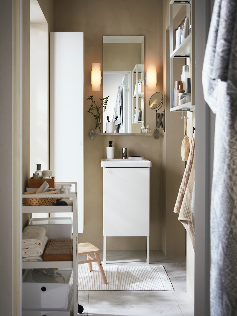 「洗臉盆櫃雖然不大,但只要在櫃下放張腳凳,就能充分利用櫃頂空間。智能燈泡也是我最新的好朋友,無論是梳洗休息或化妝打扮,都能有最棒的光。」
