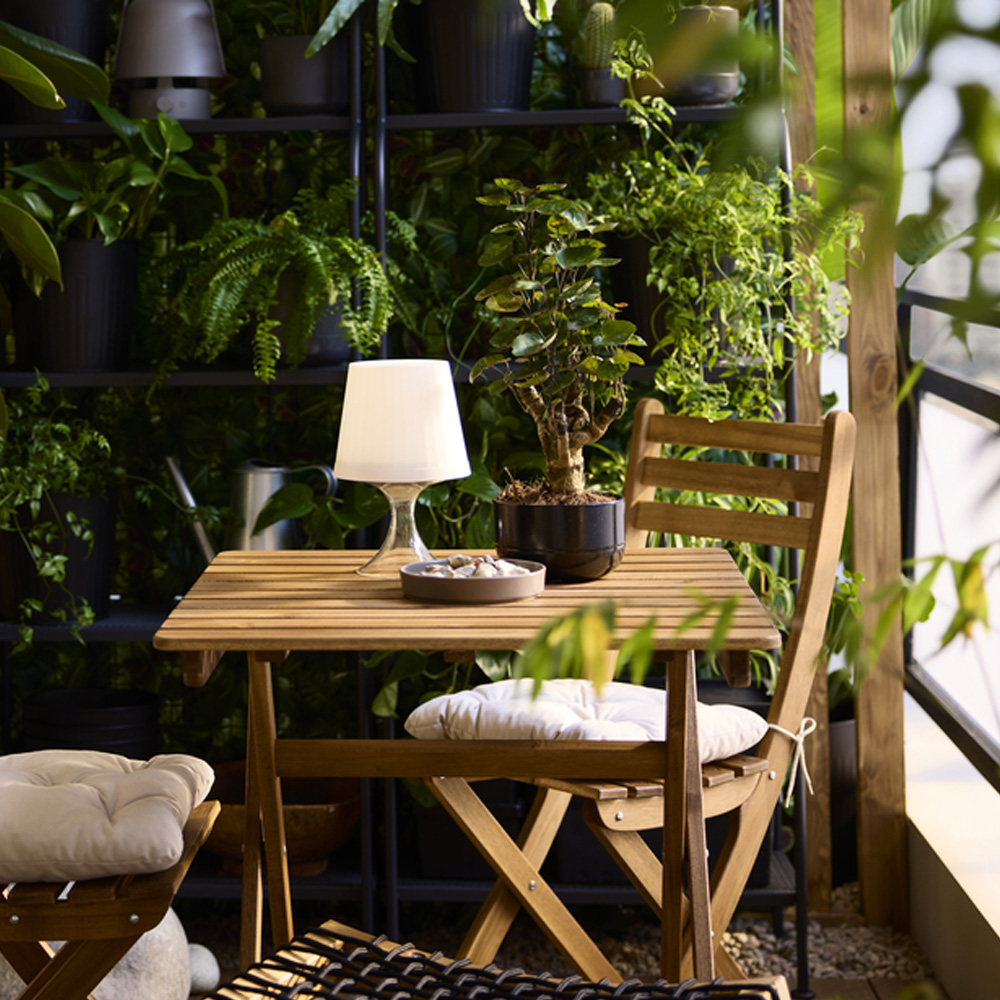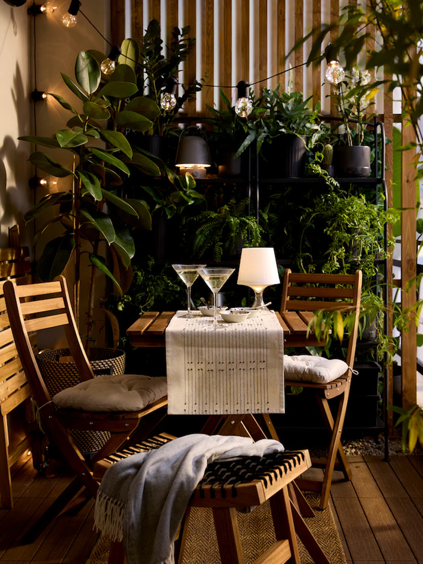 試試強調戶外氛圍,甚至讓想像力帶著自己置身小小綠洲。使用 UTLÄNGAN 木質感戶外拼接地板,劃分出陽台與室內,作為綠意小天地的基底。隔牆上覆蓋人造植物,既能確保隱私,也流露自然氣息。最後放上層架和色系協調的花盆,層層堆疊綠意,給空間生機活力。