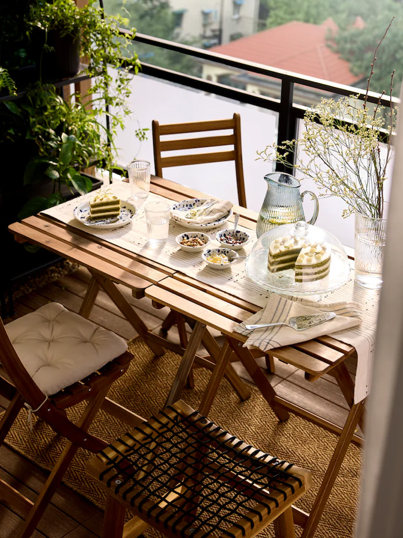 或許你的陽台只需要一張雙人桌,試試換成折疊桌與同款輕巧椅凳,讓空間更靈活多變。多一點桌面空間,就能隨手擺放需要的東西,不必頻繁進出室內,也不用擔心一個轉身就把蛋糕打翻。