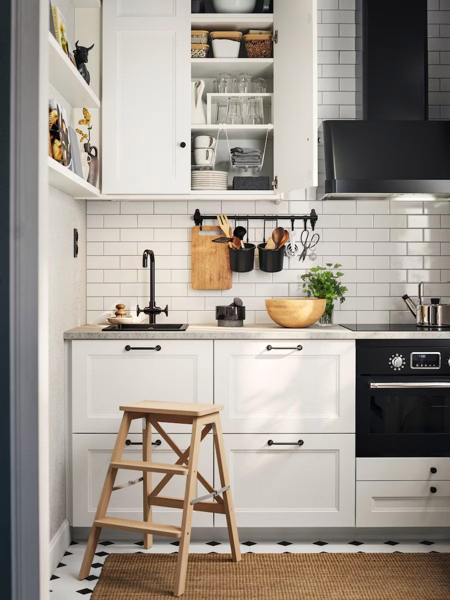 想要兼顧好看和收納?小坪數一樣能做到!聰明利用溫馨小廚房的牆壁空間,在高處的壁櫃裡整齊收好烹飪小物,窗戶上方和周圍也都是令人驚喜的收納空間。讓雜亂隱身來創造更多餘裕,盡情享受下廚時光。