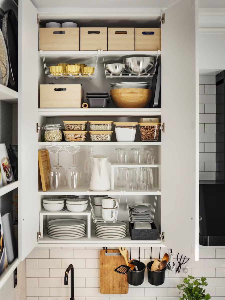 誰說小就不能優雅?充分利用廚房高度,使用線條柔和的嵌入式收納層架,在霧白色面板後方創造大量的實用收納空間。層架分隔板讓物品保持整齊有序,也避免受到磨損。