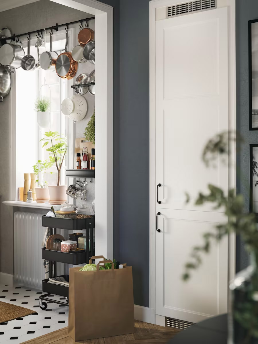 當空間有限,試試打破既有框架來尋找創意解方吧。在小廚房裡,把廚具懸掛在窗台上方,就變成獨特的窗簾!用掛鉤懸掛廚具,把保鮮盒放在層架上,能靈活移動的推車裝滿了食材,冰箱就在一旁角落,所有必備品都準備就緒。