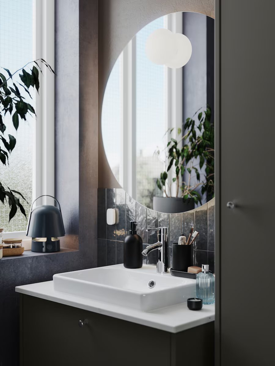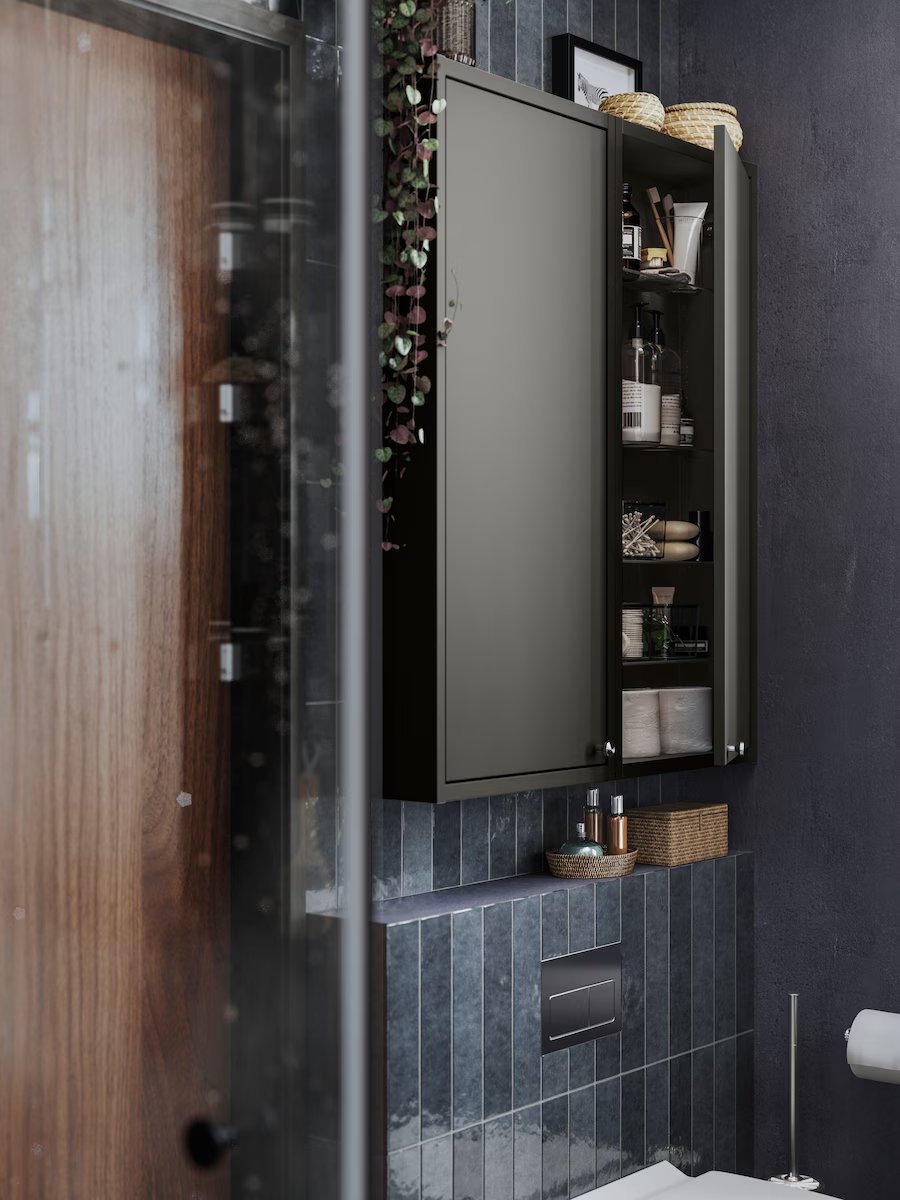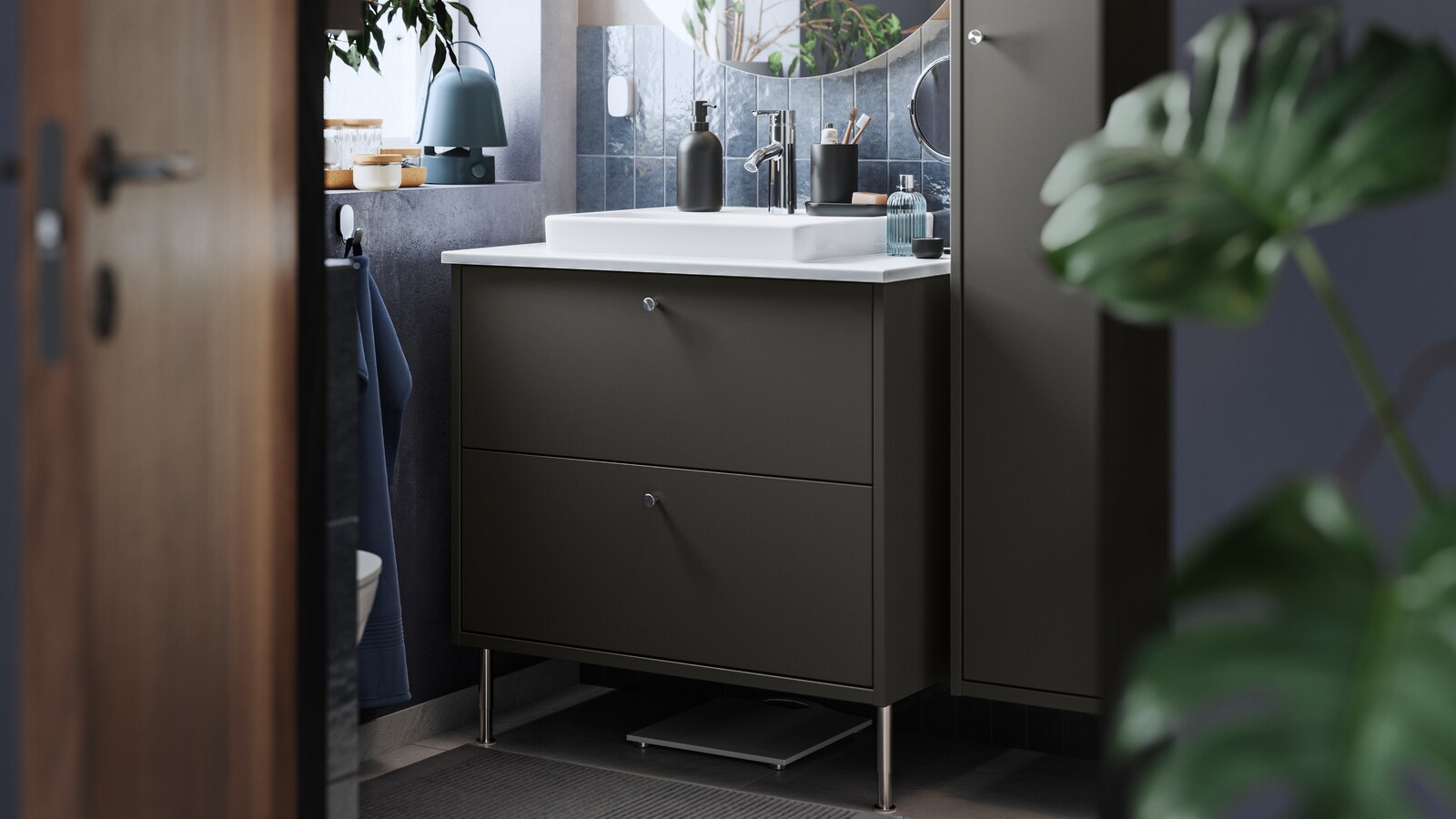 這間浴室看起來或許很小,但善用洗手臺和牆櫃內部設計精良的收納空間,就能讓整個外觀看起來井然有序。簡約清爽的深灰色設計,配以宜人且充足的光線,而半嵌入式的洗臉臺和櫃臺則可以根據您的喜好搭配選轉式開關或把手,呈現你的個人特色。