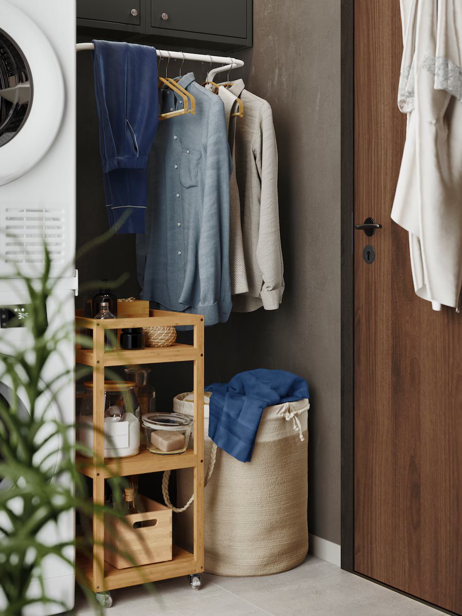 找出一個順手的流程能讓日常家事變得更輕鬆愉快。這間浴室裡設有一個實用的洗衣區,可以在非常有限的空間裡進行衣物分類、洗滌和晾曬,又不會影響外觀風格。而老師傅用傳統工藝編織的黃麻編織洗衣籃字帶手柄,方便攜帶,且附帶可拆可洗的內袋。洗衣精和其他用品則可以存放在靈活可動的手推車上。整個環境乾淨又簡潔。