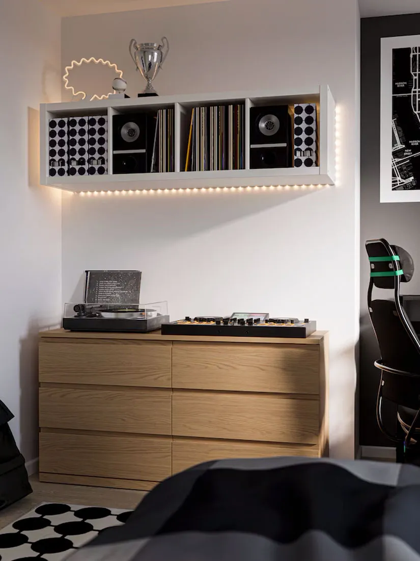 沒人會看到抽屜裡亂成什麼樣子,重點是把抽屜上方空出來,好好展示你的心愛物品!只要騰出展示空間,任何嗜好或興趣都能成搶眼亮點。還缺地方?加個壁掛式層架,創造更多收納與展示,避免佔用珍貴的地面空間。
