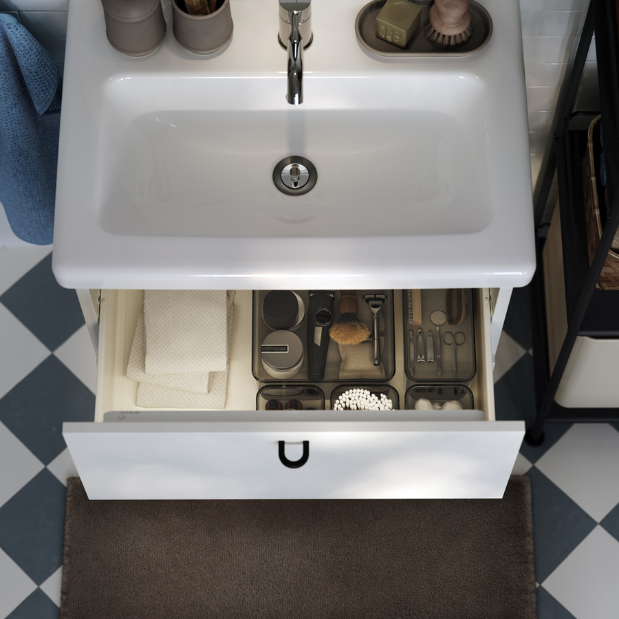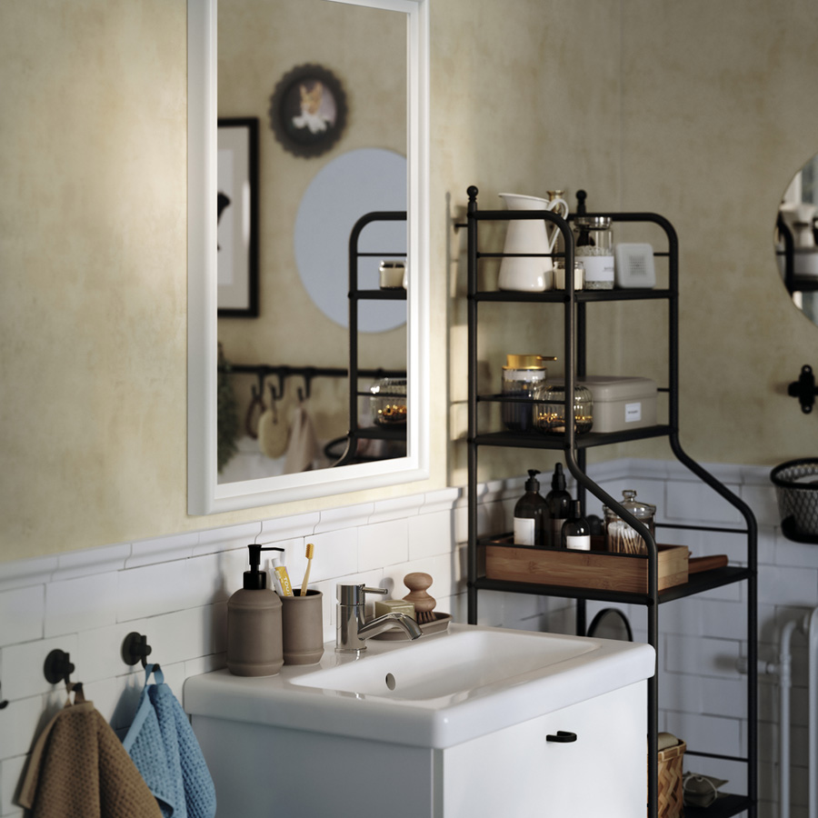 這款白色 ENHET 洗手盆櫃,是日常洗漱與收納雜物的好幫手。寬敞的抽屜設計,提供便利又充足的收納空間,使用更輕鬆。搭配霧黑色 BORGHAMN 金屬把手,為空間增添一點復古風格;粗陶器配件、斜角鏡子,以及帶有精緻裝飾的層架,更展現出迷人的手作質感。