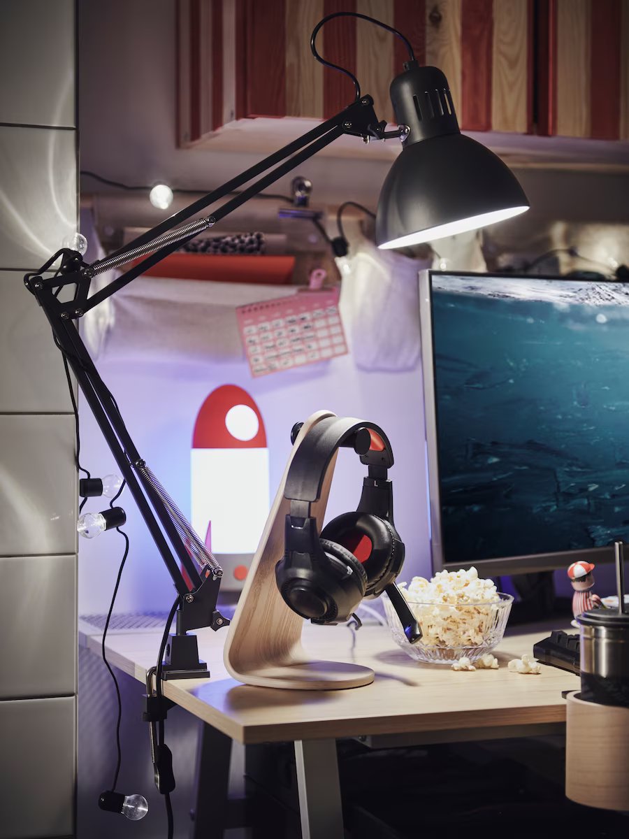 寬敞工作桌、提供足夠支撐的座椅和井然有序的收納規劃,非常適合電競遊戲(和家庭作業!)保有傳統外觀的同時,運用小巧思來創造驚喜,例如選擇有著木質紋理的桌面來呈現現代風格。牆面上精心挑選的海報,在松木壁櫃刷上經典條紋,呼應對面的特色牆,為空間創造想要的風格。