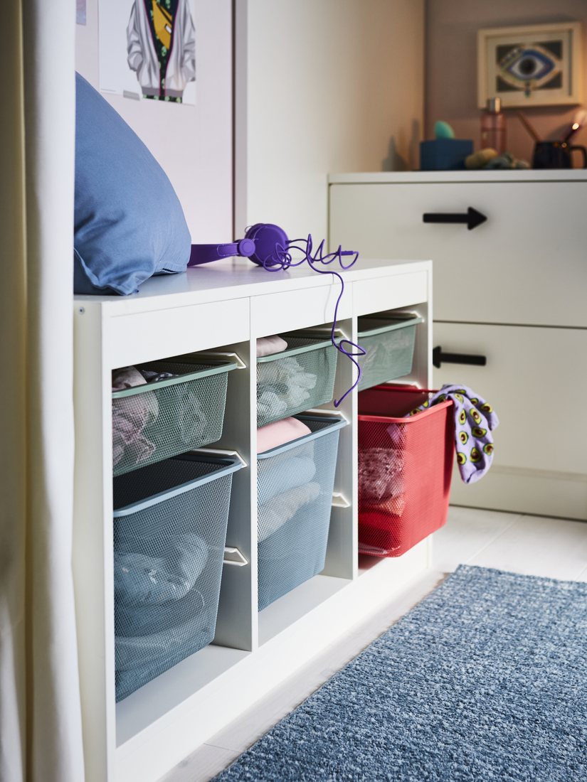 在這個悠閒空間裡,一切一目了然。金屬網眼式收納盒採用柔和原色,組出色彩繽紛的收納角落。透視網眼式設計使色彩變得柔和,有助營造漸變效果,既能看見盒內物品,也保持一致的外觀。