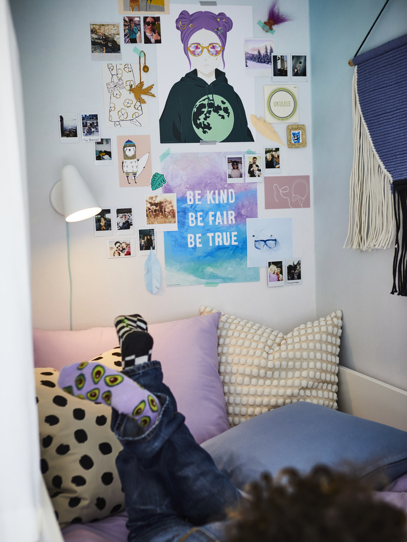 以觸感舒適的織品佈置空間,例如彈性的彩色靠枕、地毯、窗簾和柔軟寢具,創造奪目迷人的愜意休閒角落和有趣的背景。添加不同材質和圖案的裝飾品,便能保持夢幻奇特的感覺。