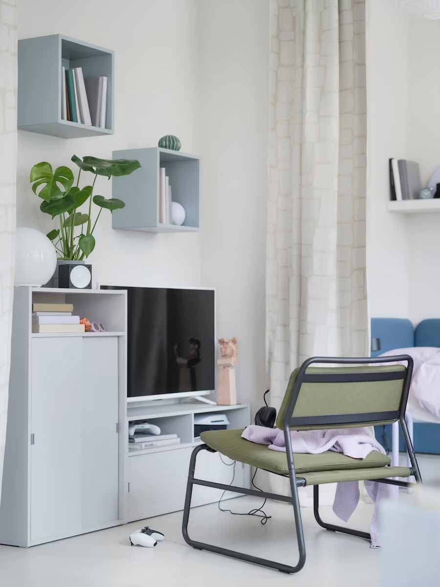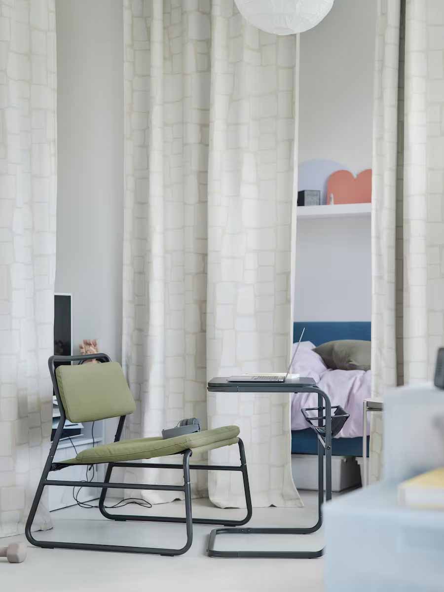 生活瞬息萬變,家也是如此。舒適的學習區位於房間中央,放置著橄欖綠單椅和簡約百搭的小邊桌;朋友來訪時,迅速變成暢聊咖啡區。需要專注時就拉上窗簾,把塵囂拋到腦後。
