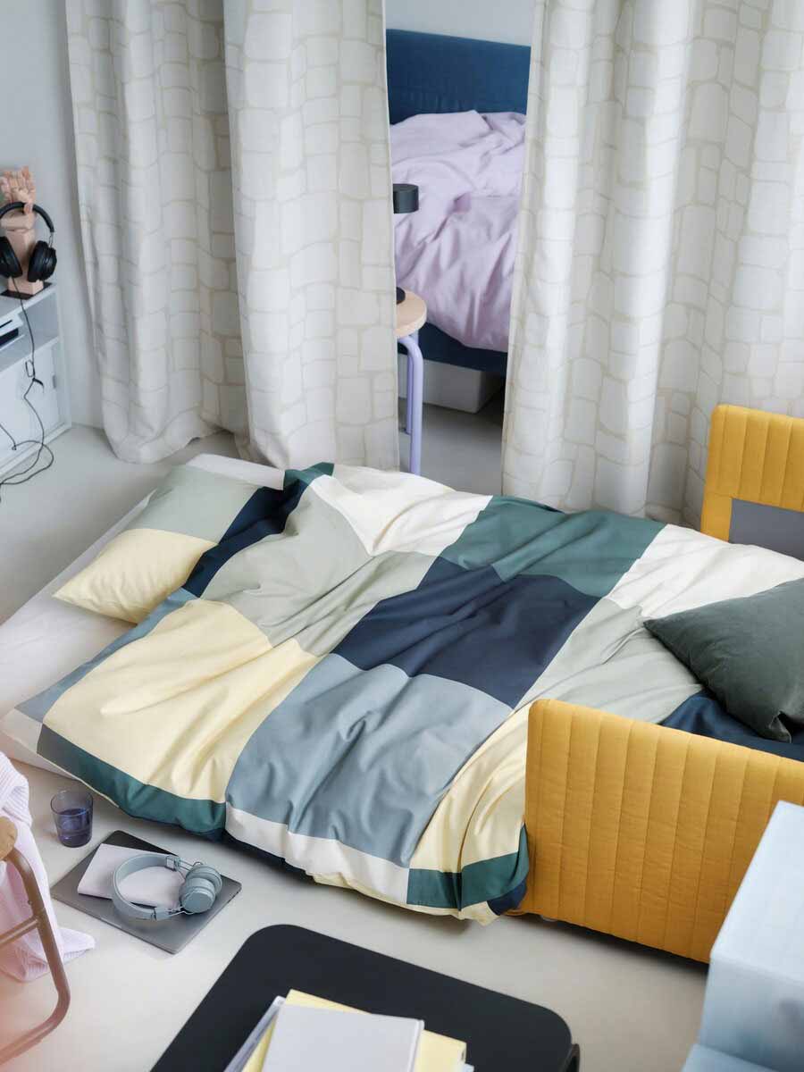 能靈活變換面貌的沙發床,加上織品作為隔間,夜晚是好眠睡床,白天搖身一變成休閒小角落。搭配遮光窗簾隔絕外界干擾,睡得更香甜;米色印花窗簾為空間增添一絲優雅,也感覺更舒適。