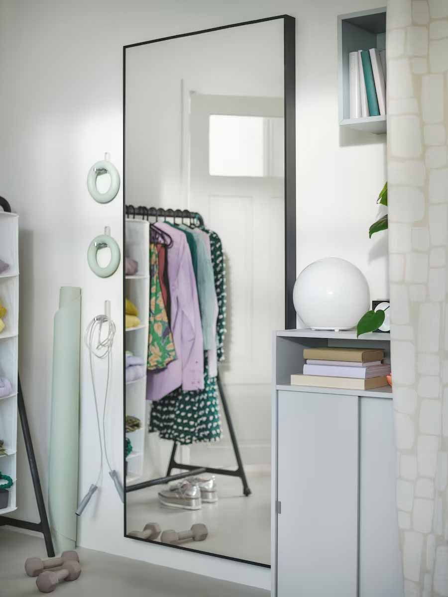 身為想讓衣服和配件成為空間亮點的穿搭達人,帶輪腳的吊桿黑色衣櫃是絕佳收納解方。堅固、有型且易於移動,搭配全身鏡檢查每日穿搭,還能讓空間更明亮。