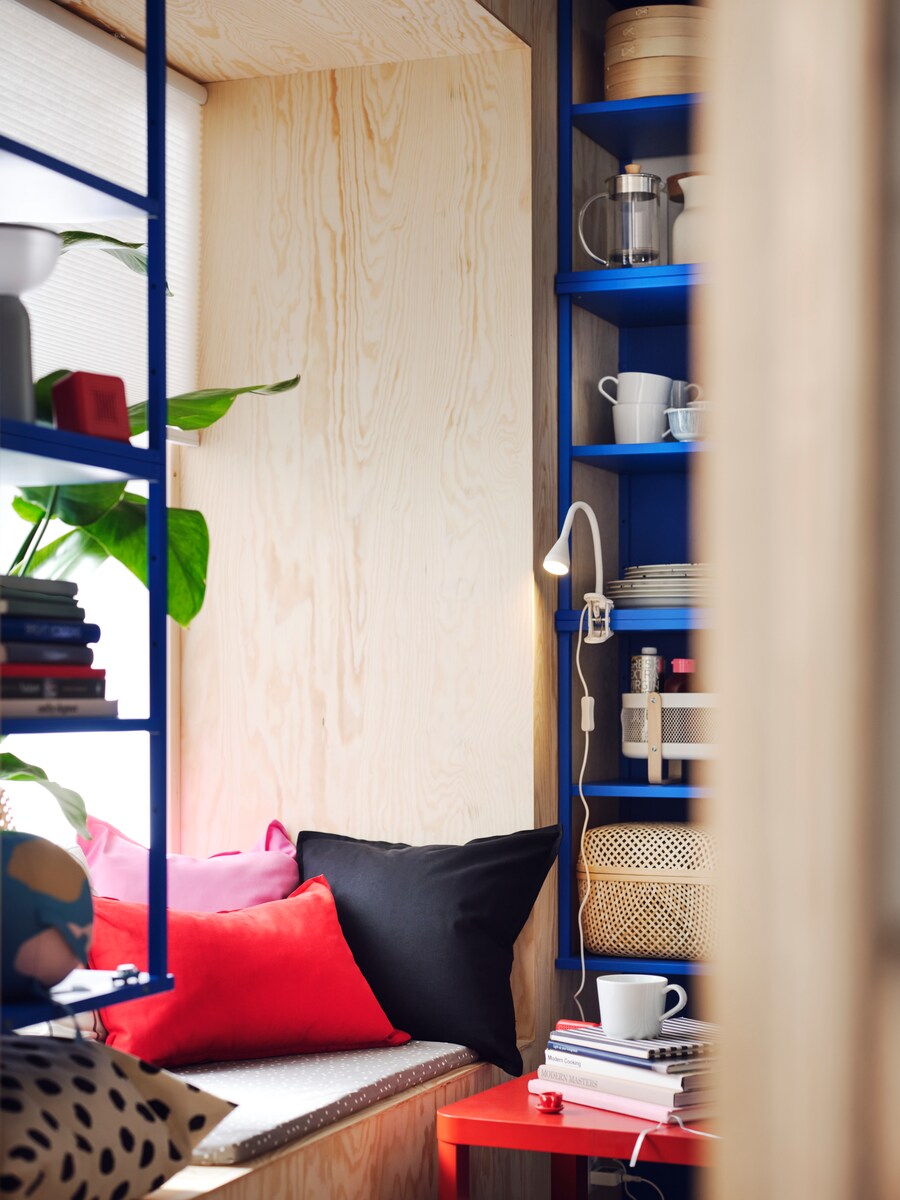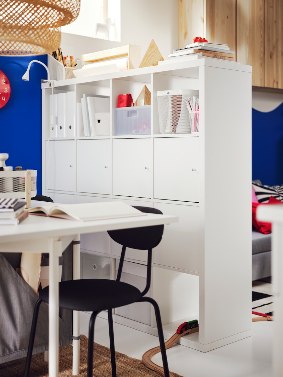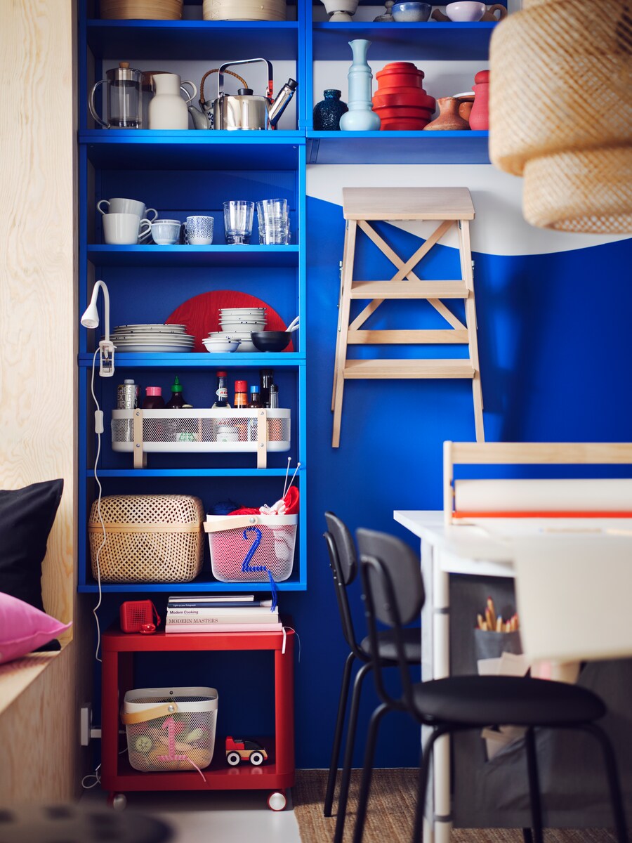 可兼作房間隔間的收納層架,從兩側都可收納取用物品。搶眼的藍色收納層架組不但有型,也方便存放餐具。專家小秘訣:將餐具套組放在一起收好,看起來就會更整齊。