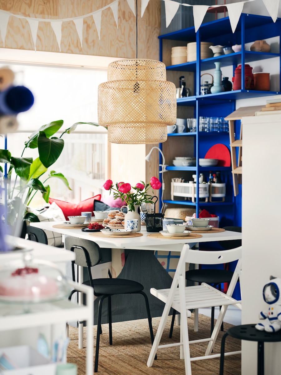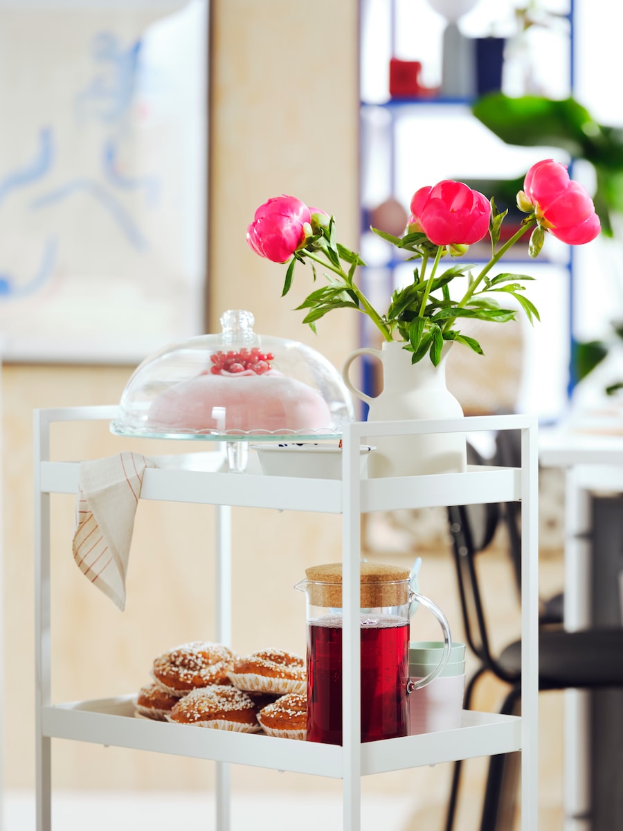 即使是小空間,一樣能隨時舉辦盛大聚會。把桌子移到靠近窗戶的位置,創造額外的座位空間。拿出平時收好的椅子,再加上好用的置物推車;在這個特殊的日子裡,最適合用作蛋糕車。盡情享受吧!