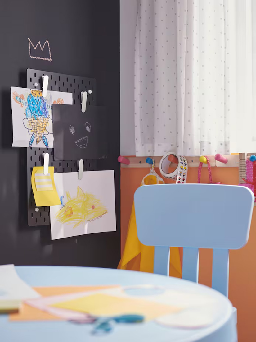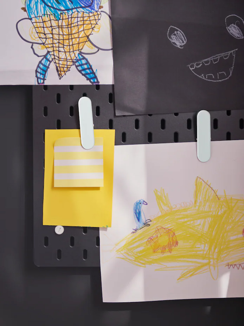 將 SKÅDIS 收納壁板安裝在牆上,專屬孩子的藝術展示區瞬間誕生。可以用夾子固定畫作,或者在收納壁板後加上黑色留言板,增加更多發揮空間。靈活好用的收納壁板,能隨著孩子成長進行調整,做多樣化應用。
