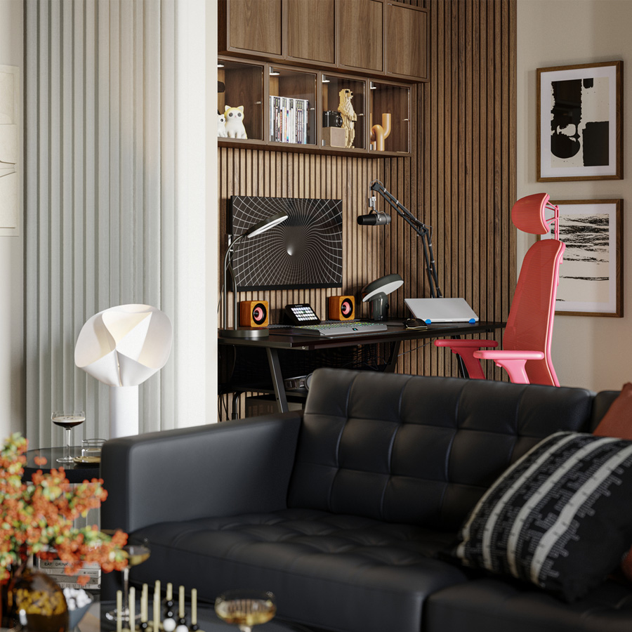 這個多用途的現代小客廳不但能配合用餐和遊戲休閒的需要,更是拍照打卡的完美背景。這裡結合巧妙的收納方案、溫暖舒適的布料,再加上能瞬間轉換氣氛的智慧燈具,讓你擁有實用又舒服的空間,令人忍不住點讚!