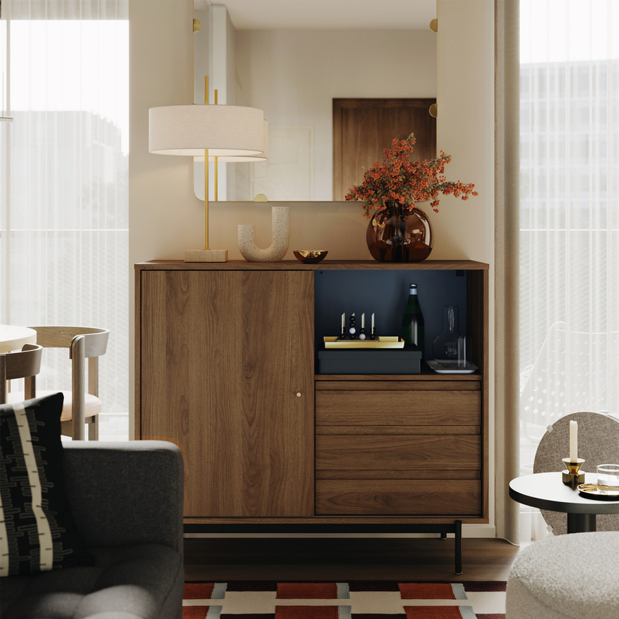 RÅDMANSÖ 收納櫃帶有溫暖的胡桃木紋色調,搭配黑色金屬腳,櫃體顯得挑高又輕巧。它是展示收藏好物的完美舞台,也能為你的居家風格加分。櫃內抽屜與滑門背後的層板提供充分的收納空間,生活物品整齊收好,空間常保清爽有序。