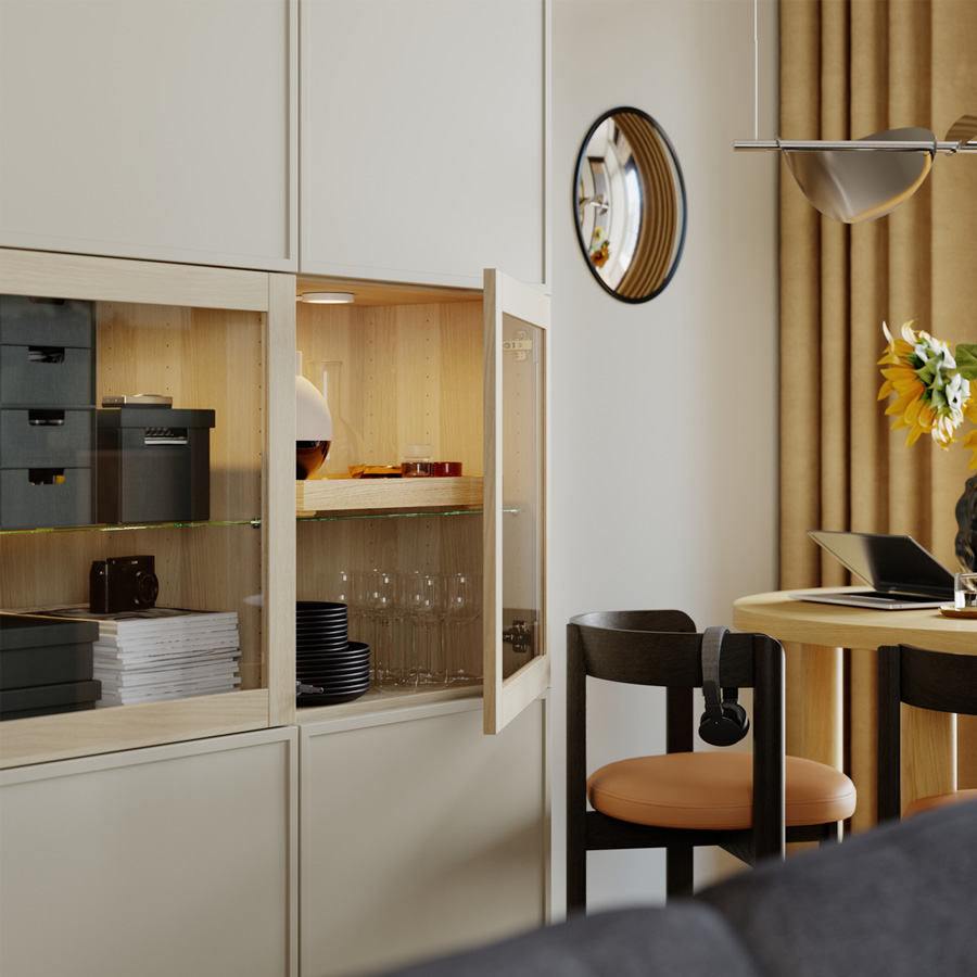 在客廳裡可以做的事太多了,你甚至可以使用 STOCKHOLM 2025 餐桌與餐椅優雅用餐。這時你可以搭配這組 BESTÅ 組合高掛於牆面,收納更多物品且不占太多地面空間。BESTÅ 系統櫃提供多種選項,滿足你的需求與空間配置,還能搭配不同門片、抽屜面板與把手,打造專屬風格。你可以選擇現成組合,也能自行創造獨一無二的收納方案。
