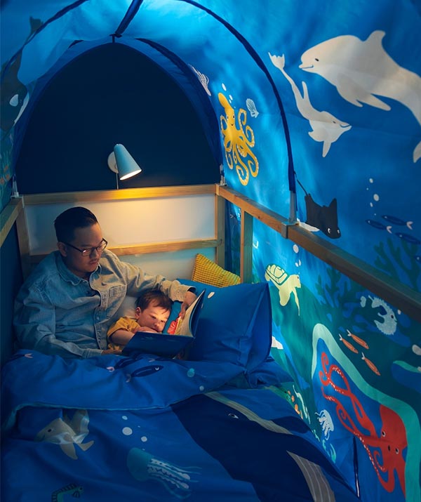 以溫暖的寢具、柔軟的絨毛玩具和夢幻燈具,為孩子創造寫意的空間。印上海洋動物圖案的 KURA 兒童床頂篷,劃出舒適的小天地,讓孩子安然入夢。