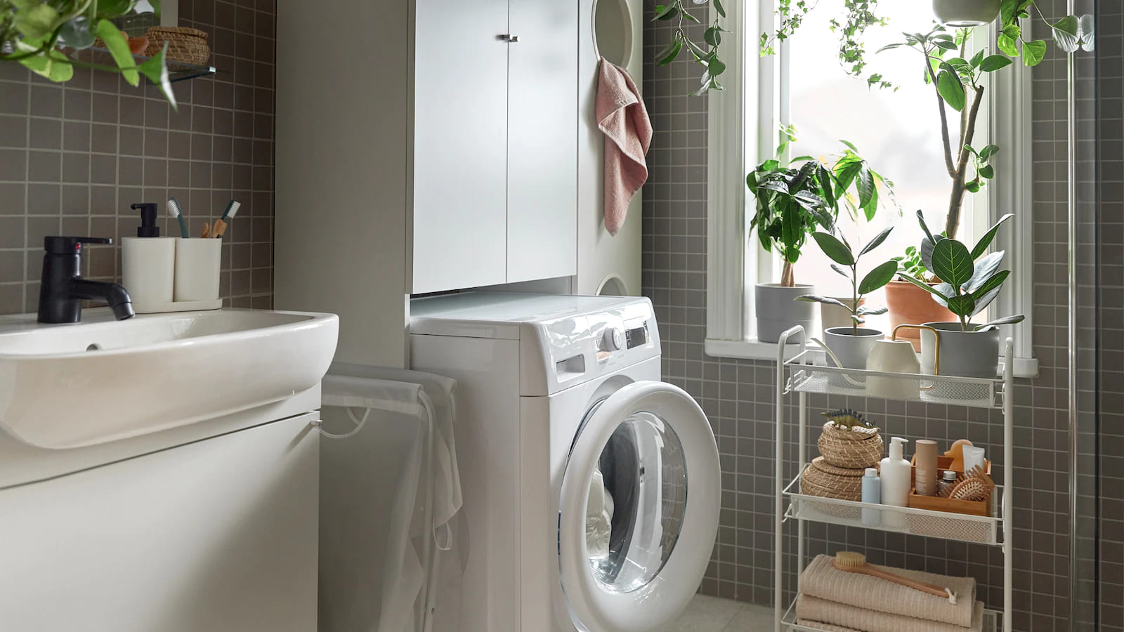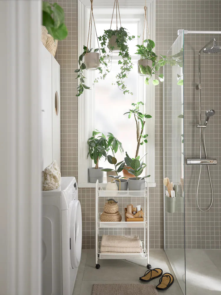 我們為這間現代公寓的小浴室打造出功能齊全的沐浴兼洗衣空間,風格清新開揚,同時具備現代設施和大量收納空間。掛起或擺放大量植物,營造溫室般的自然氣息,再加入柔和色彩,使洗衣時光變得更輕鬆愜意。