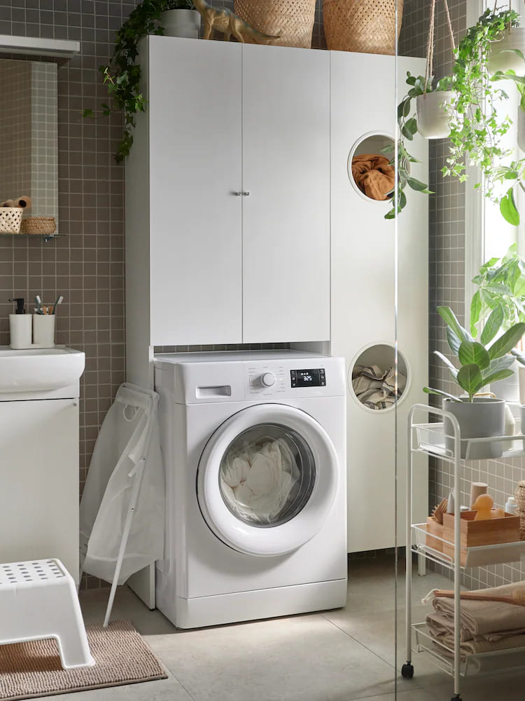 這個小巧而清爽的浴室兼洗衣區佈置,把洗衣機隱藏起來,也為全家人提供充足的收納空間,可以把衣物分類整理和收好,與浴室用品一起整齊放好。小巧實用的家具和一致的風格,使小空間也能變成功能齊全的浴室。