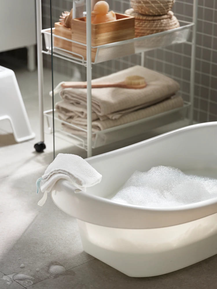 靈活的浴室能照顧所有人的需要,也設有多人共用的多用途空間。我們加入綠色清新的植物營造悠閒氣氛,同時添置方便移動的推車,整齊收納物品。這個浴室把自然感覺與實用功能結合,更為孩子準備了專屬的空間,便能告別凌亂,使一切回復平靜。