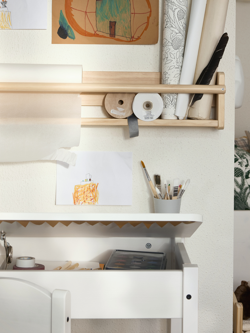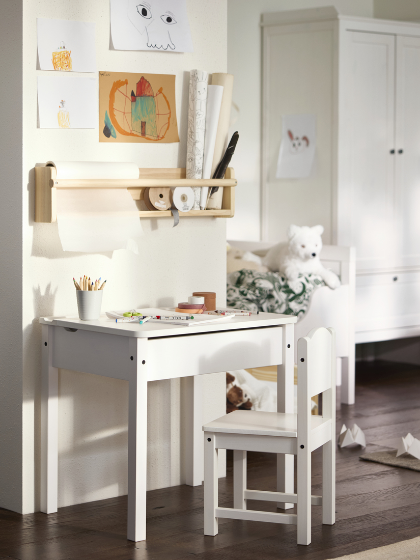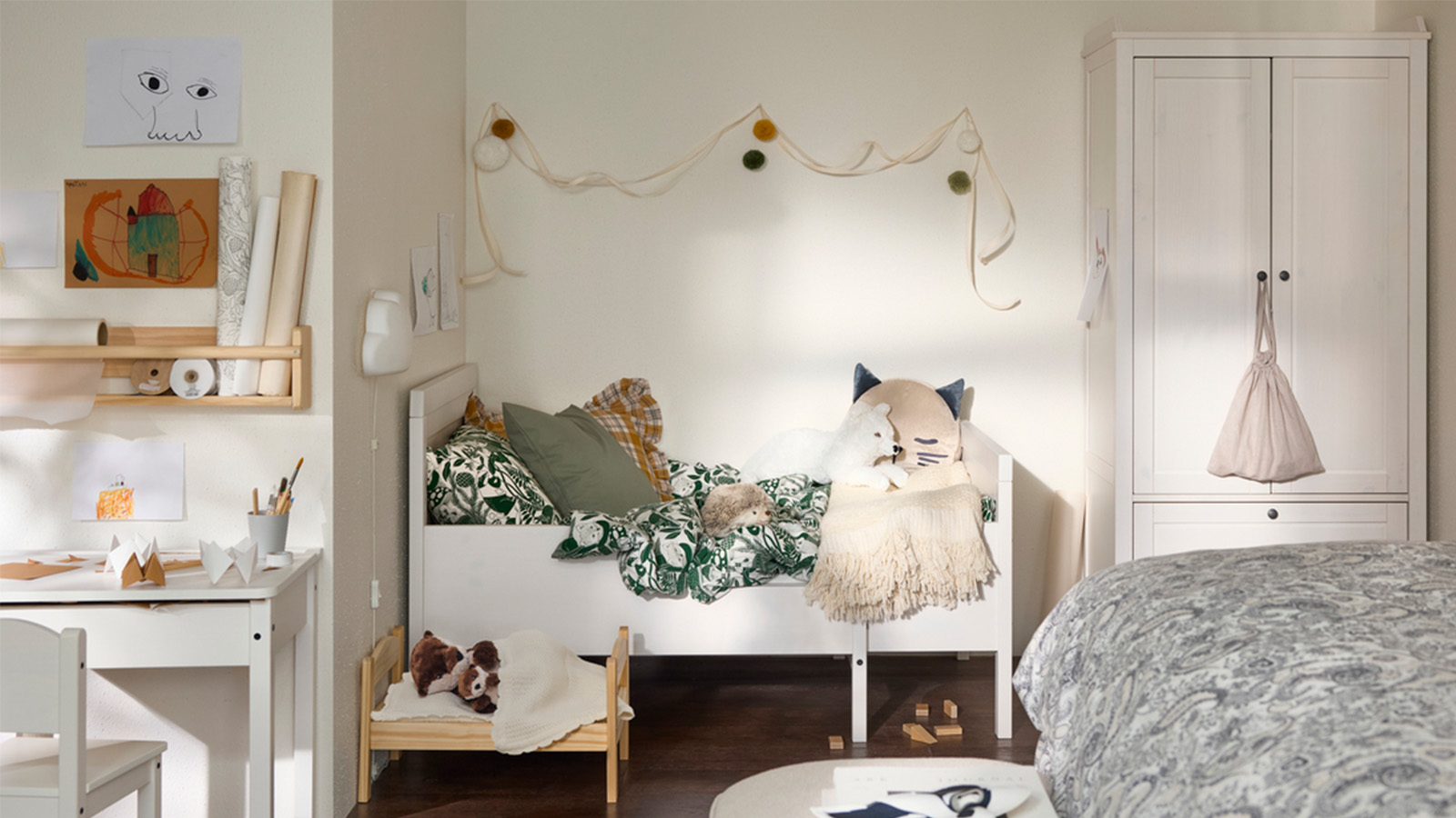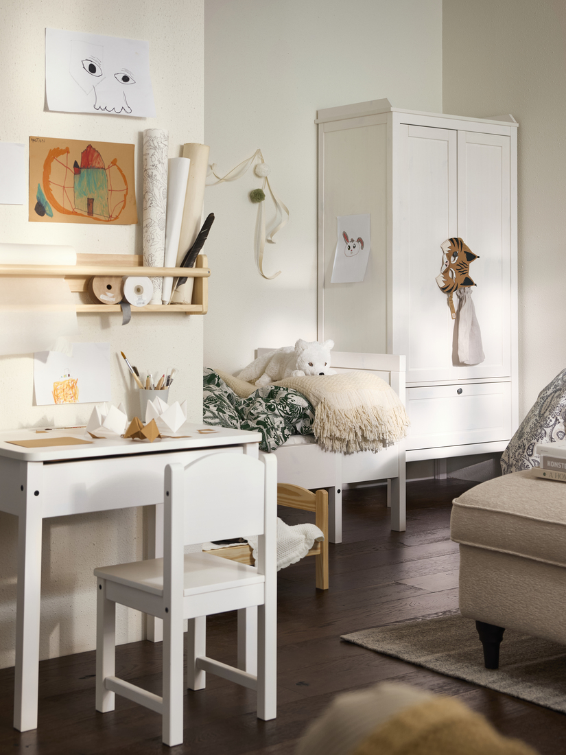 臥室是最私人的空間,但依舊能和家中成員共享,秘訣是為每個人創造專屬區域,搭配精心規劃的收納。SUNDVIK 兒童家具系列,簡單潔白的小尺寸家具,能和整個房間的風格輕鬆相搭,感覺更整齊溫馨!
