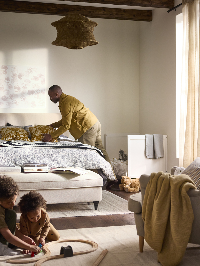 家裡每個人都可以一起享受悠閒時光,即使有著不同的上床睡覺時間。當大人在鋪床時,孩子可能正在駕駛載有重要貨物的火車,而另一個孩子正在盡最大努力阻擋這列火車……無論如何,重要的是你們都在一起,這始終是讓一天變得美好的最佳方式。