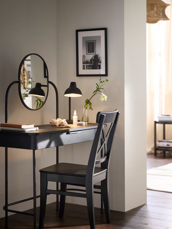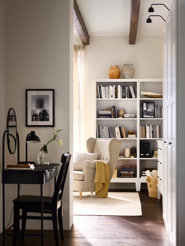簡約現代又帶有經典感的GRÅFJÄLLET 化妝台,適合任何風格和小空間。在這裡細心照顧自己,享受獨處時光。在臥室裡擺放書架,也是創造寧靜感的好方法;即使還沒翻開書,也能感受書本帶來的和諧美好。
