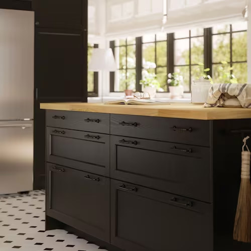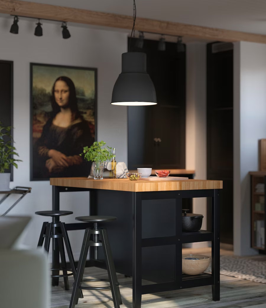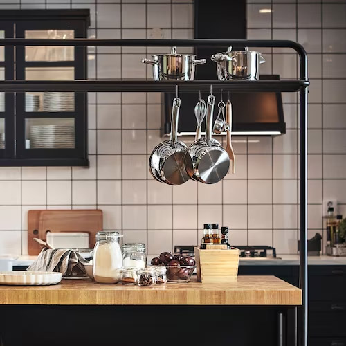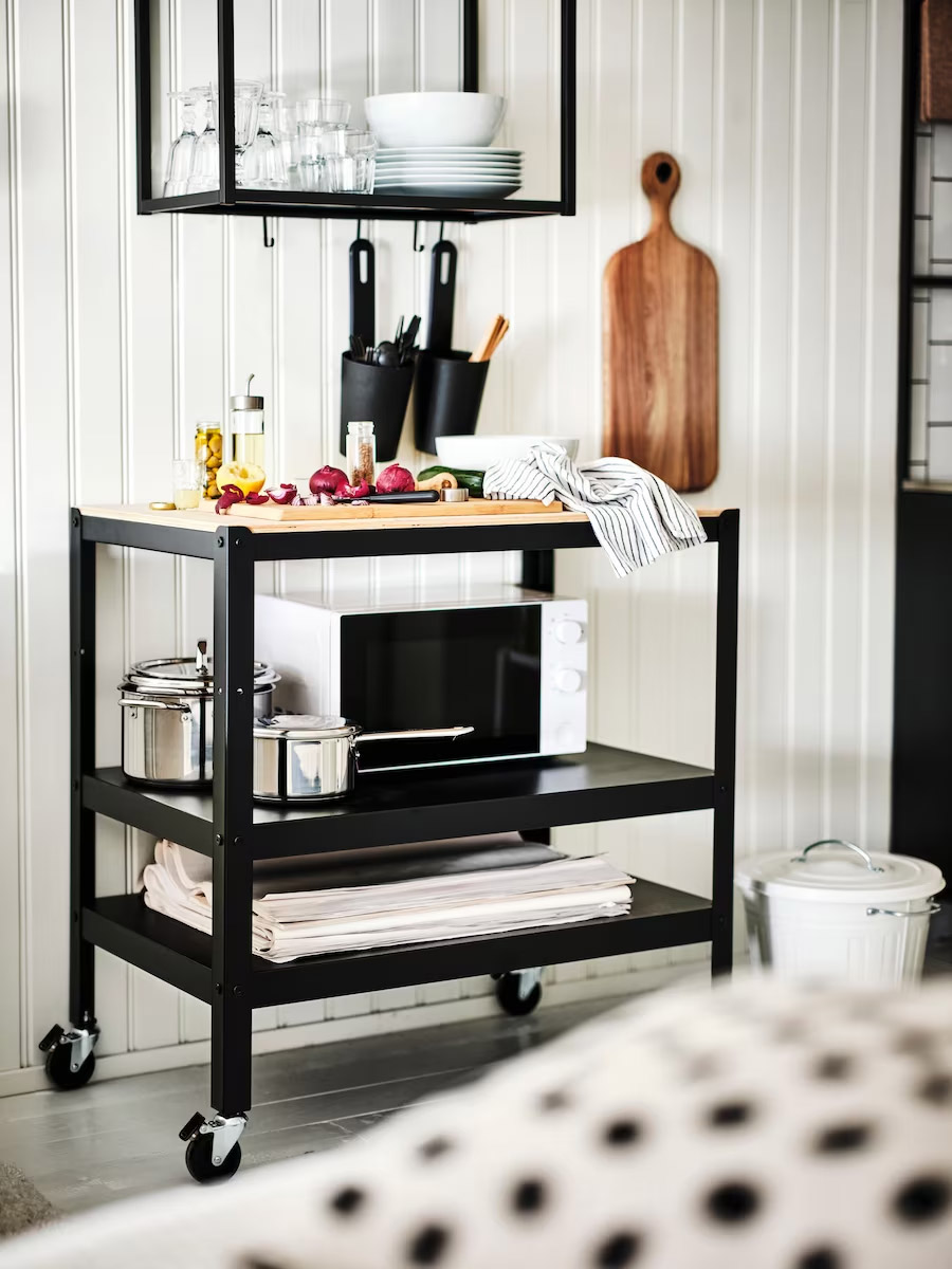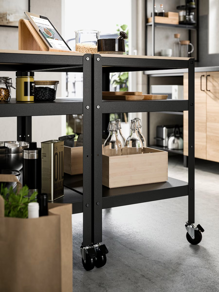 不只時尚好看,有著堅固黑色鋼質結構的四輪推車(也就是帶輪中島)非常耐用,可承受潮濕和大重量。依照你的需求靈活變化,可單獨使用,或者並列兩個推車來創造更多收納空間和工作檯面。