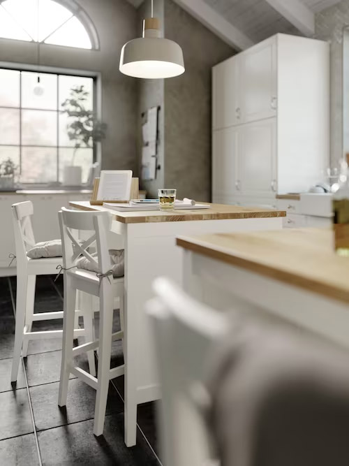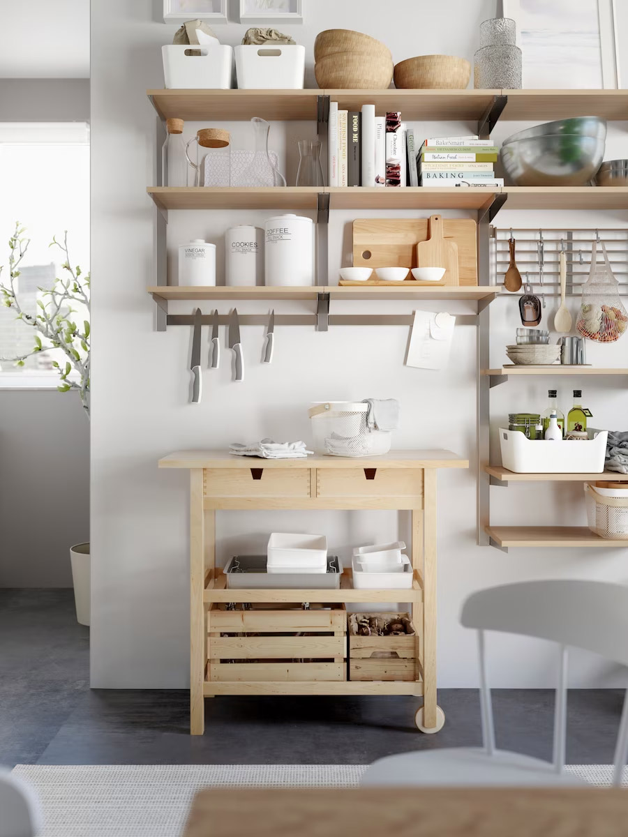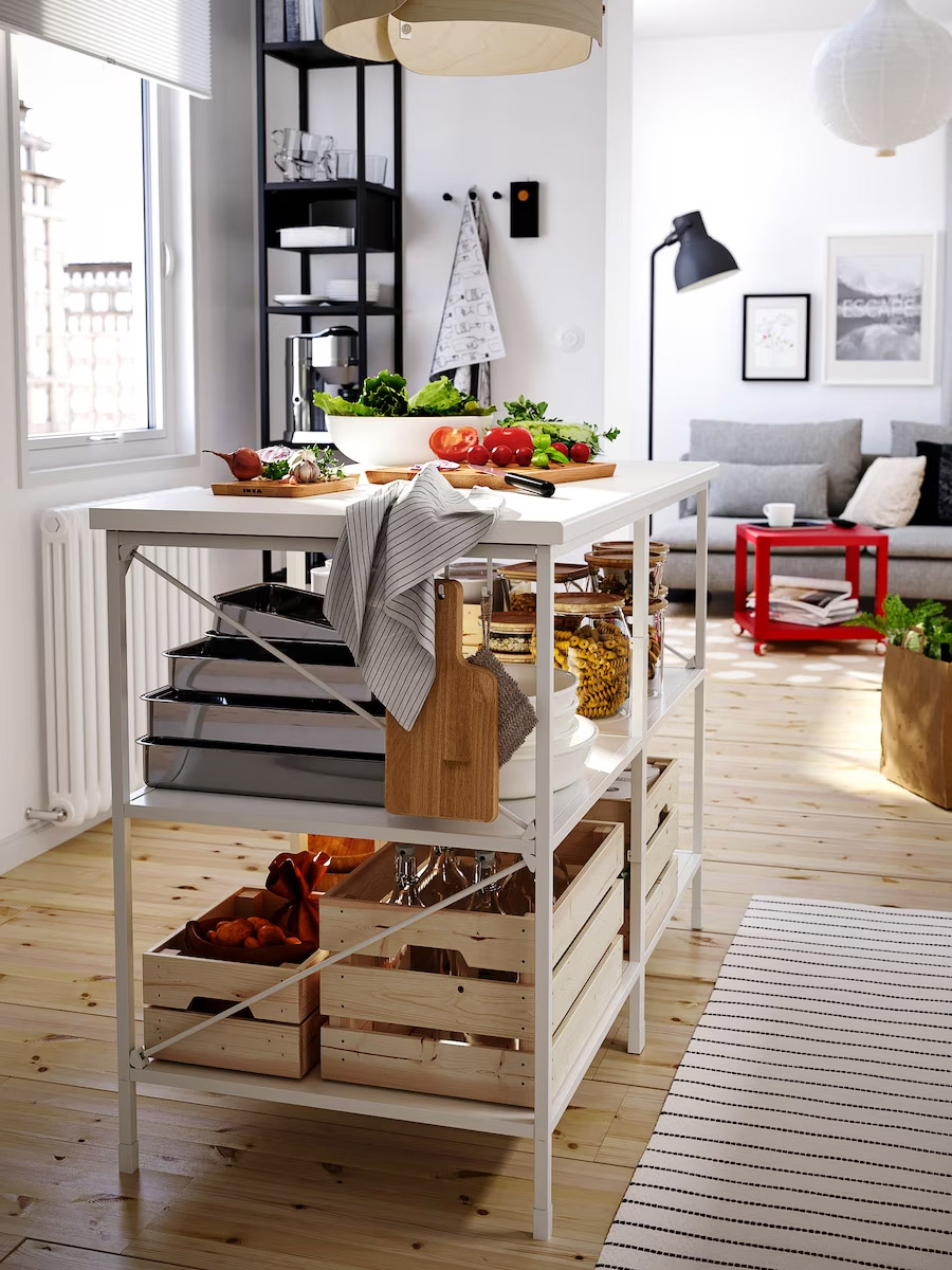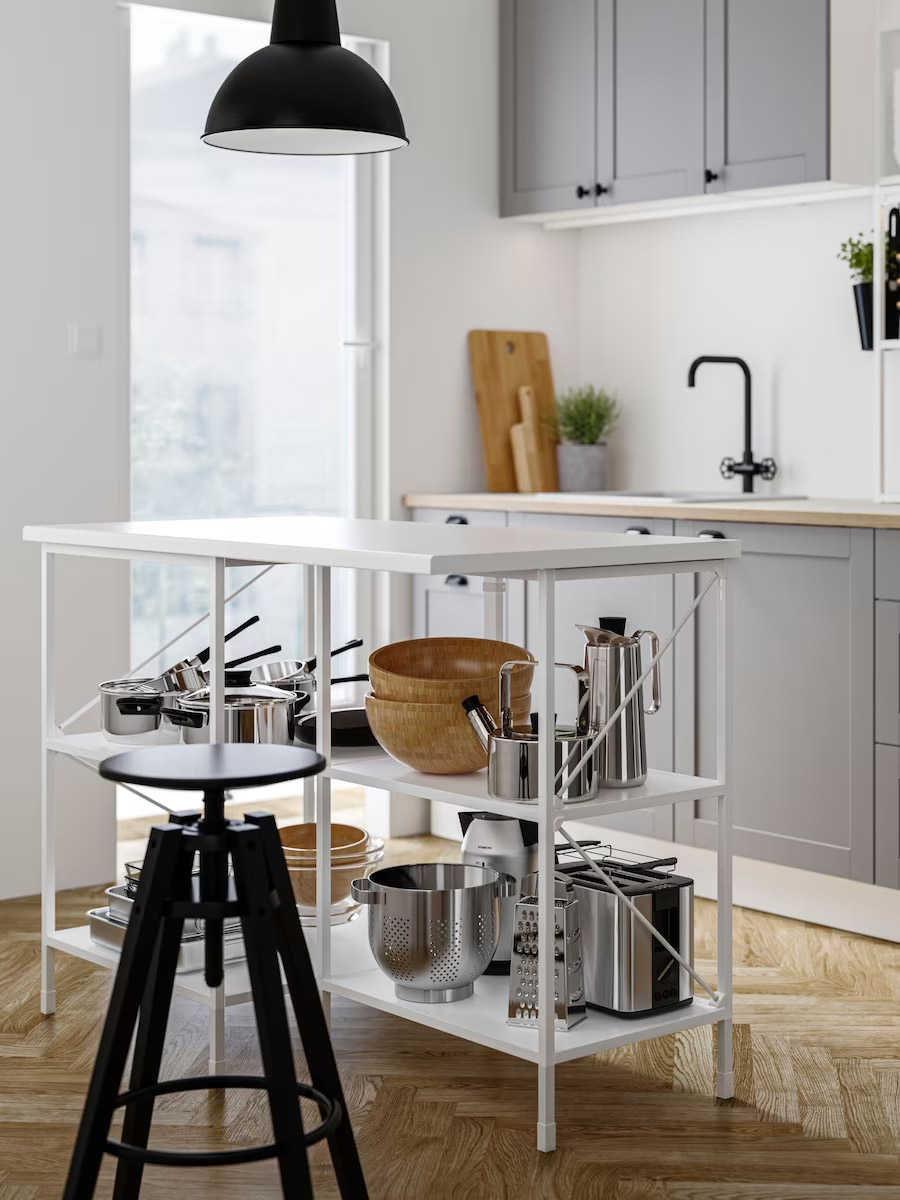 即使是小廚房,也非常適合放置中島。用層架和上方掛桿來增加收納,也更輕鬆拿取廚房用具。搭配幾張吧台椅,邀請親友一起準備食物;不用時輕鬆把椅子推到檯面下,騰出更多空間。
