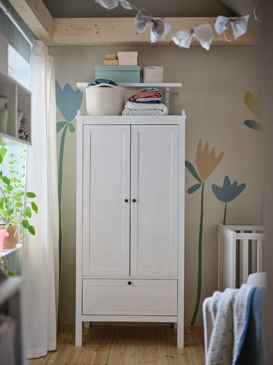 小寶貝也要有屬於自己的家具!造型簡約的傳統風格衣櫥,不但能和嬰兒床和尿布更換桌搭配,還能輕鬆收納寶寶的所有重要物品。內部或上方可以加上收納箱,整理零碎或形狀不規則的小物;也能把備用床單和毯子收在寬敞抽屜裡,方便隨時取用。