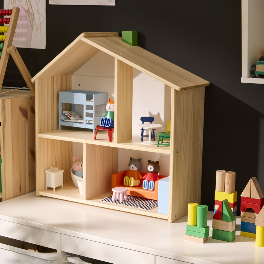 無論大人或小孩,FLISAT 歡迎每個人的到來。你也可以把這間小屋掛在牆上,所有 HUSET人偶與家具都能完美擺放在每個房間裡。當小小屋主玩累了,這間小屋還能變成收納小物的好幫手。結論是:你永遠不會太老,玩娃娃屋永遠都適合!