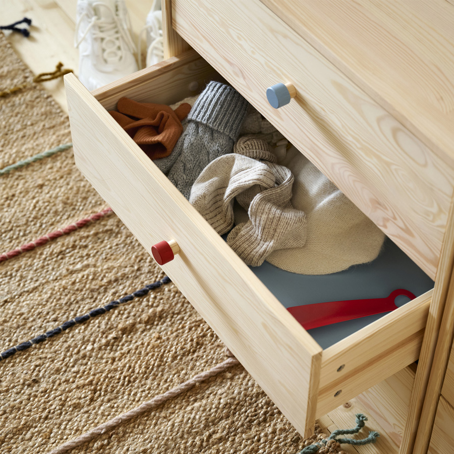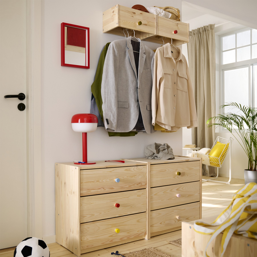 想在玄關把東西掛高一點,RAGGBERG 衣帽架一樣好用,在下方搭配適合狹窄空間的同系列 RAST 抽屜櫃,收納空間再升級。這些收納好物均採實心松木製作,可隨心打磨、上油、上漆或染色,滿足各種需求。這也延長了使用壽命,日後可以隨心所欲換新裝。