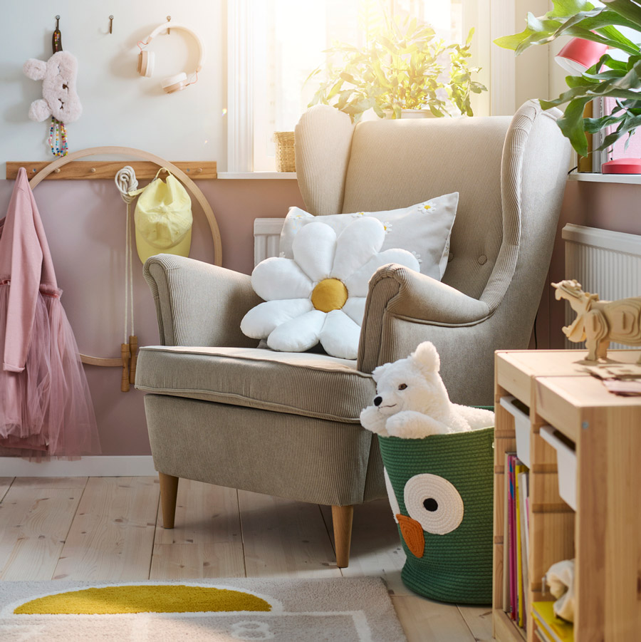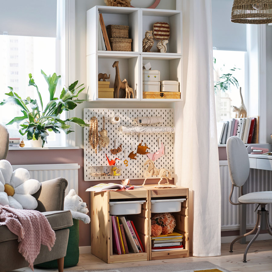 一起開始學習吧!孩子逐漸適應新作息和學校節奏,也慢慢發展出適合自己的學習方式。試試為孩子打造舒適又能靈活變化的學習與手作空間吧!無論什麼活動,都能隨時就位。身體想動一動?在書桌後方鋪上地毯,方便伸展跑跳的活動天地立即成型。 善用牆面層架收納書籍、學習用品、文具,或者 NATTBAD 藍牙喇叭,好拿又不佔空間;把書桌放在床的另一邊,幫助孩子集中注意力。淡灰色的 SMYGA 書桌沈穩和諧的配色,百搭又耐看;隨著孩子喜好改變,還能輕鬆更換配件。