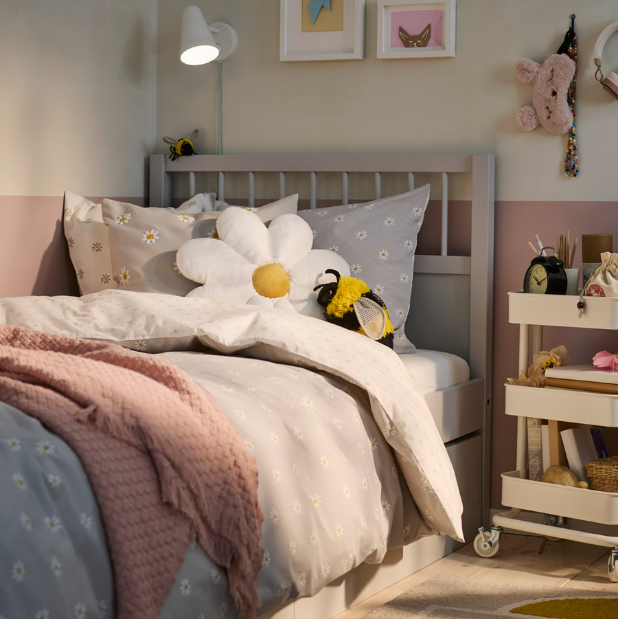 試試實木材質的 SMYGA 床,作為孩子夢想基地的起點。木質床架有著天然紋理,經典的設計,帶來獨特又溫馨的好眠氛圍。玩具、寢具或換季衣物該收哪?床下抽屜是充足又隱密的收納空間,想收什麼都能收得妥當。柔和色調適合搭配不同風格的寢具,隨著孩子的喜好輕鬆變換。加一盞FUBBLA小夜燈,以柔和的光線陪伴孩子舒適地享受睡前的閱讀時光。