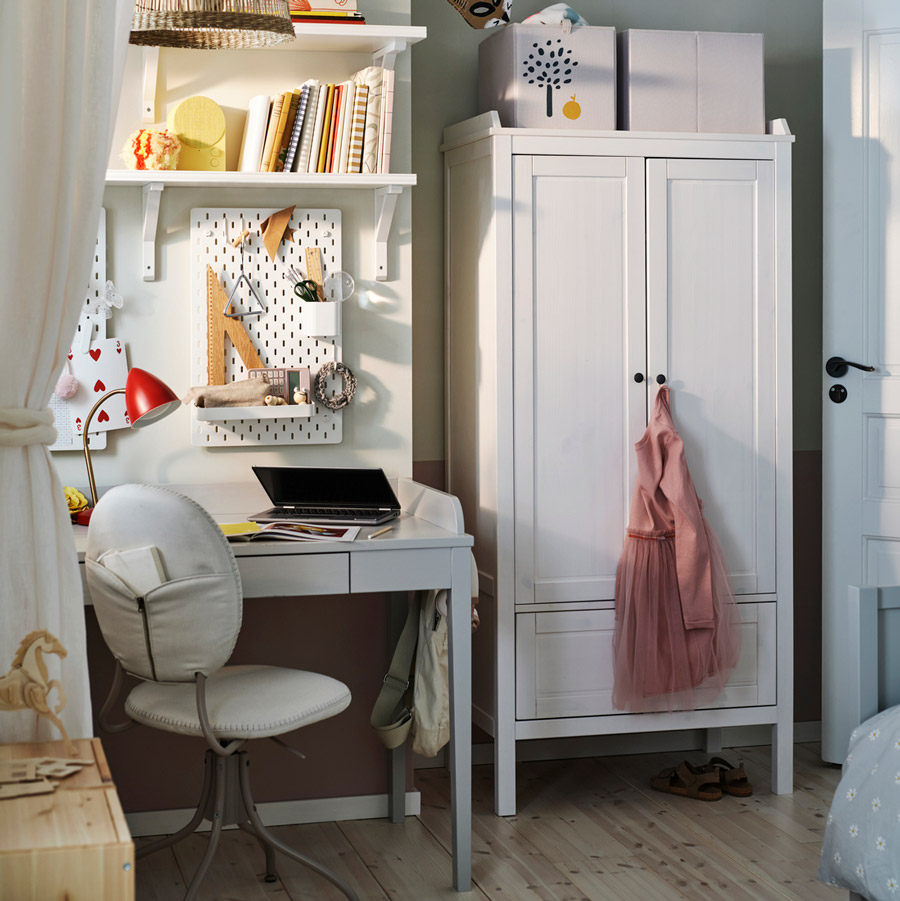 使用同系列或風格與色調相配的家具,創造協調、簡約又清爽的空間。例如擺放 SUNDVIK 衣櫃與 SMYGA 書桌,就能極大化小空間,讓整個房間更寬敞舒適。 SUNDVIK 衣櫃有著充分空間又能彈性運用,深度足以懸掛或是擺放衣物收納盒;上方的外框設計,可以整齊擺放收納籃或季節性用品,不用擔心滑落。更棒的是,衣櫃能容納標準尺寸的衣架;伴隨著孩子的成長腳步,從現在一直用到長大都沒問題。