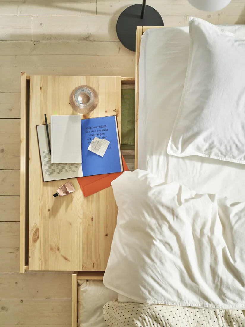 多功能 GLAMBERGET 延伸床,適合多種空間和需求。床下及內部附有收納盒,搭配可延伸床框適用不同寬度的床墊;當你需要更大的床時,可保留床框、更換床墊。附加的托盤可用於床下的兩個抽屜,或者用做床邊桌。