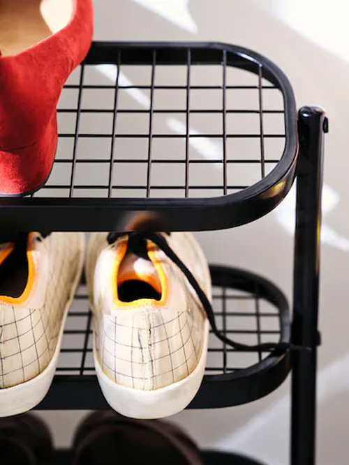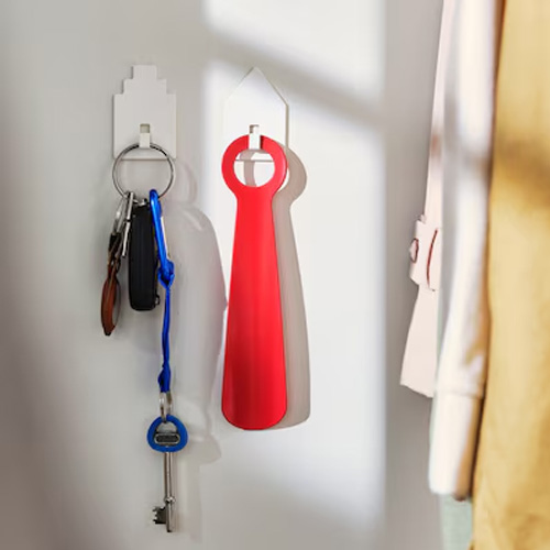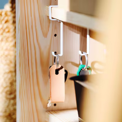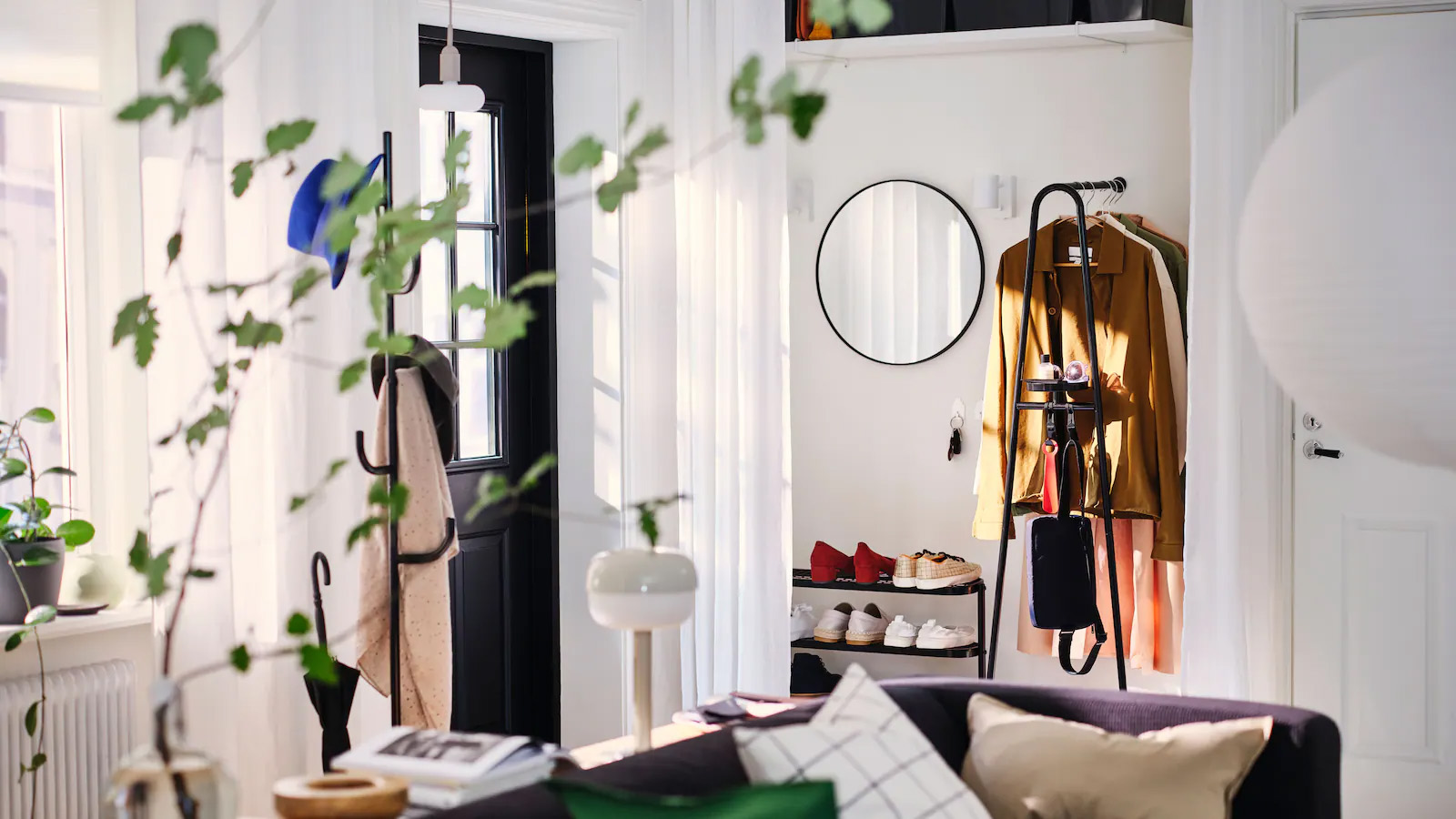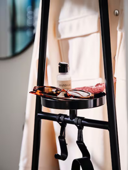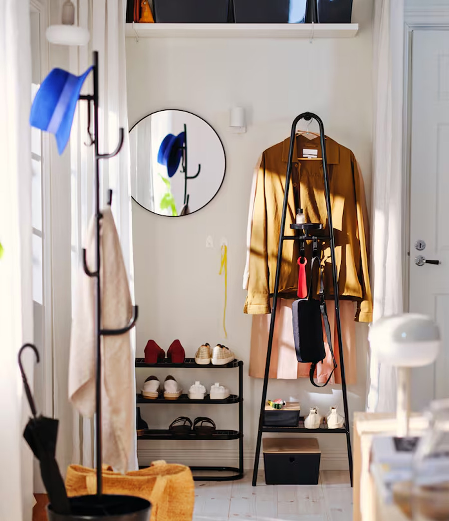 擺放 ÄLGANÄS 衣架與鞋架,巧妙為小空間創造完美結構。隱藏在角落,再搭配適合的層架,能輕鬆收納日常所需,小物也能井井有條。附帶的壁掛鉤收好鑰匙、太陽眼鏡和耳機,隨時都便利拿取。