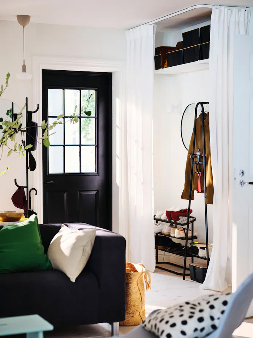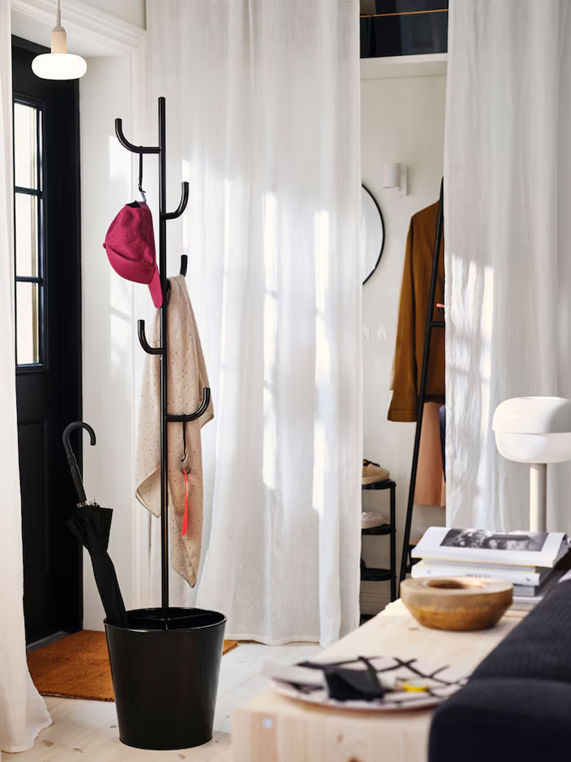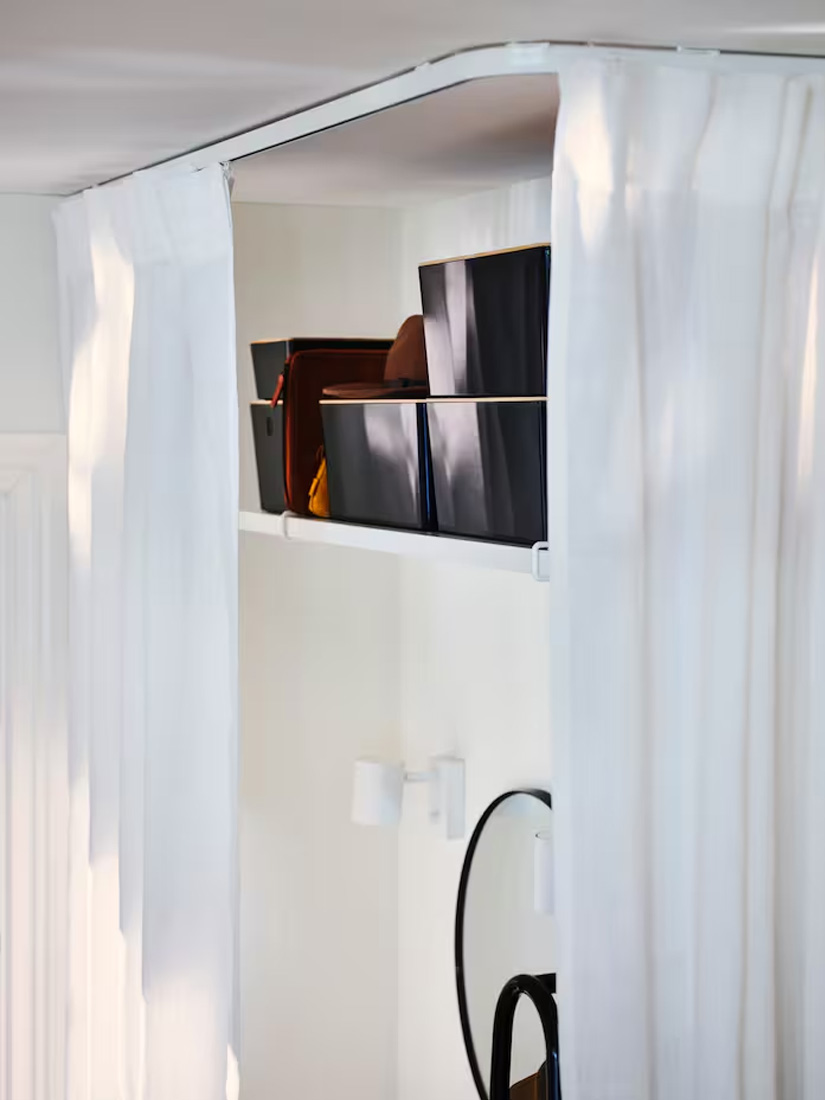 只需一幅窗簾,就能隨時切換玄關風格。想在迎接客人時展現簡約空間,或想要一秒讓雜物消失,窗簾都是最佳解方。使用 VIDGA 窗簾軌道來掛窗簾,還可根據不同尺寸的空間量身定制。