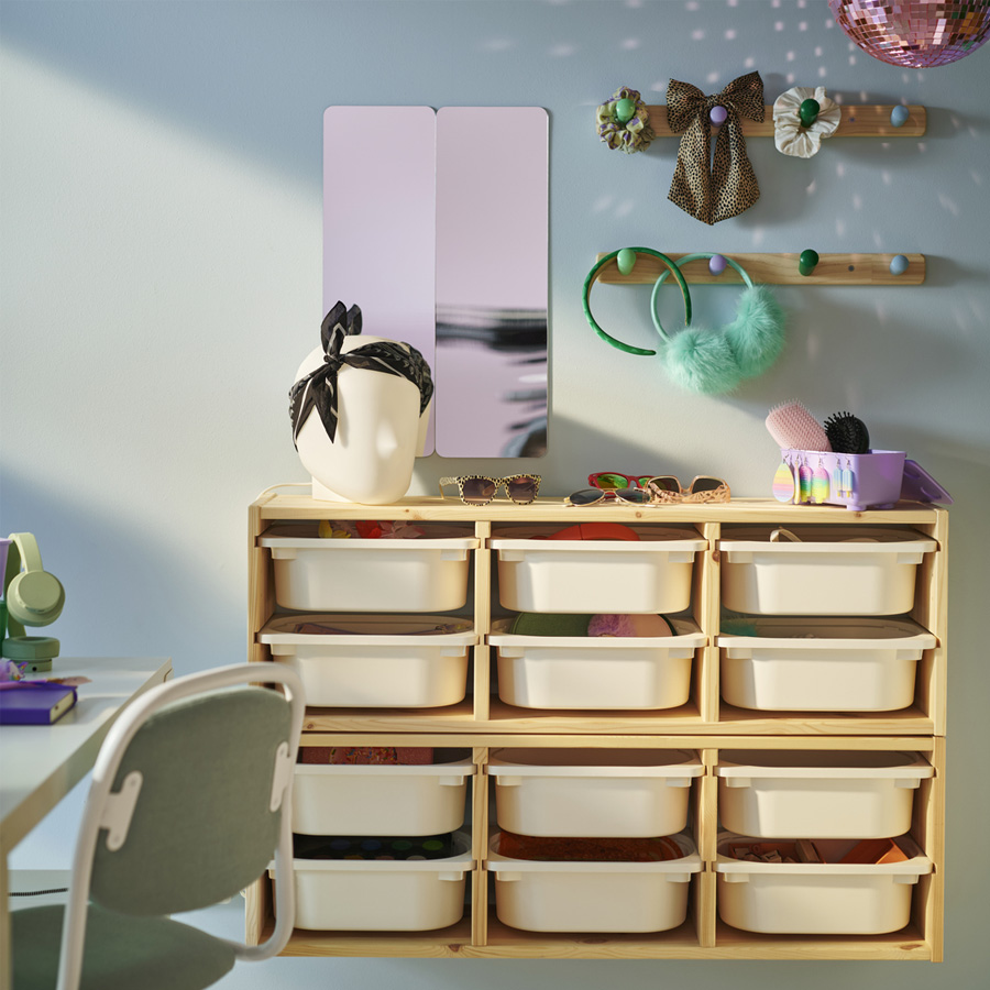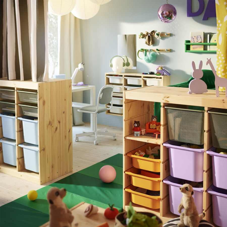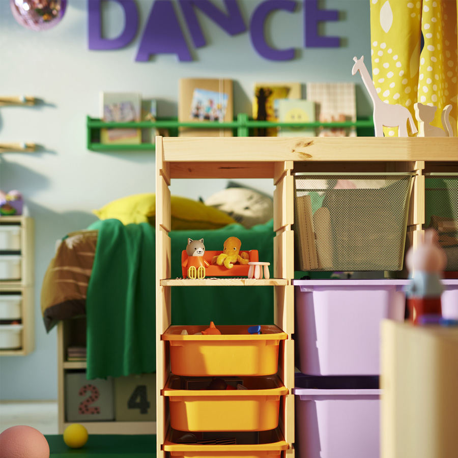 混搭 TROFAST 收納盒和層架,打造適合房間、也符合孩子個人喜好的儲物方式。