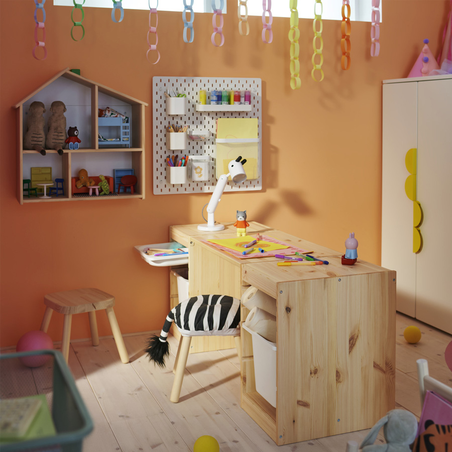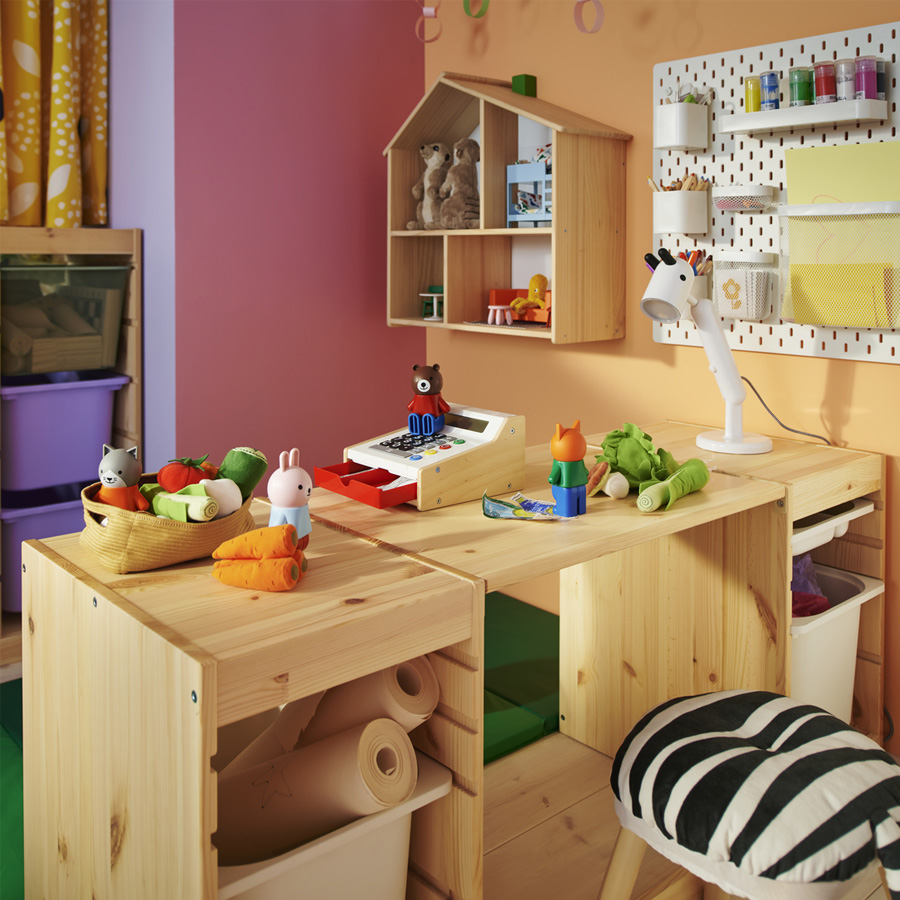 將兩張低矮的白色松木框架搭配 TROFAST 桌面,就能組成一張適合小小孩盡情創作的的簡易書桌。桌下是帶隔層的托盤和好拿的收納盒,方便收整畫具、手作材料和小玩具。
