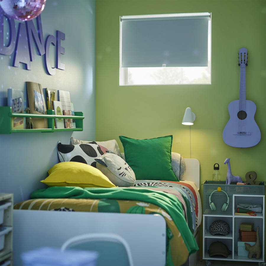 來到房間的另一側,氛圍全然不同。以 SLÄKT 床為主角,結合床下收納空間和柔軟靠墊,在這裡舒適小聚或放空,特別適合年紀稍大的孩子。實用的 FLISAT 收納在這裡發揮了重要功能:用壁架和掛鉤收好書、筆記本、耳機等日常必備物品。所有物品都觸手可及,讓孩子盡情享受 me time 時光。