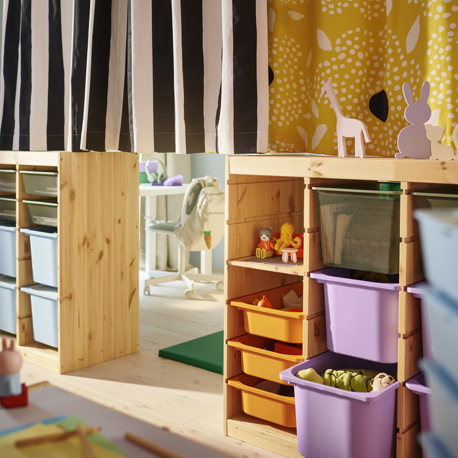 即使孩子們的年齡不同,這個共享空間能兼顧分享、照顧和玩樂;關鍵就是擺放兩組 TROFAST 收納櫃作為隔間,分別加上一道小窗簾,增加孩子想要的隱私感。
